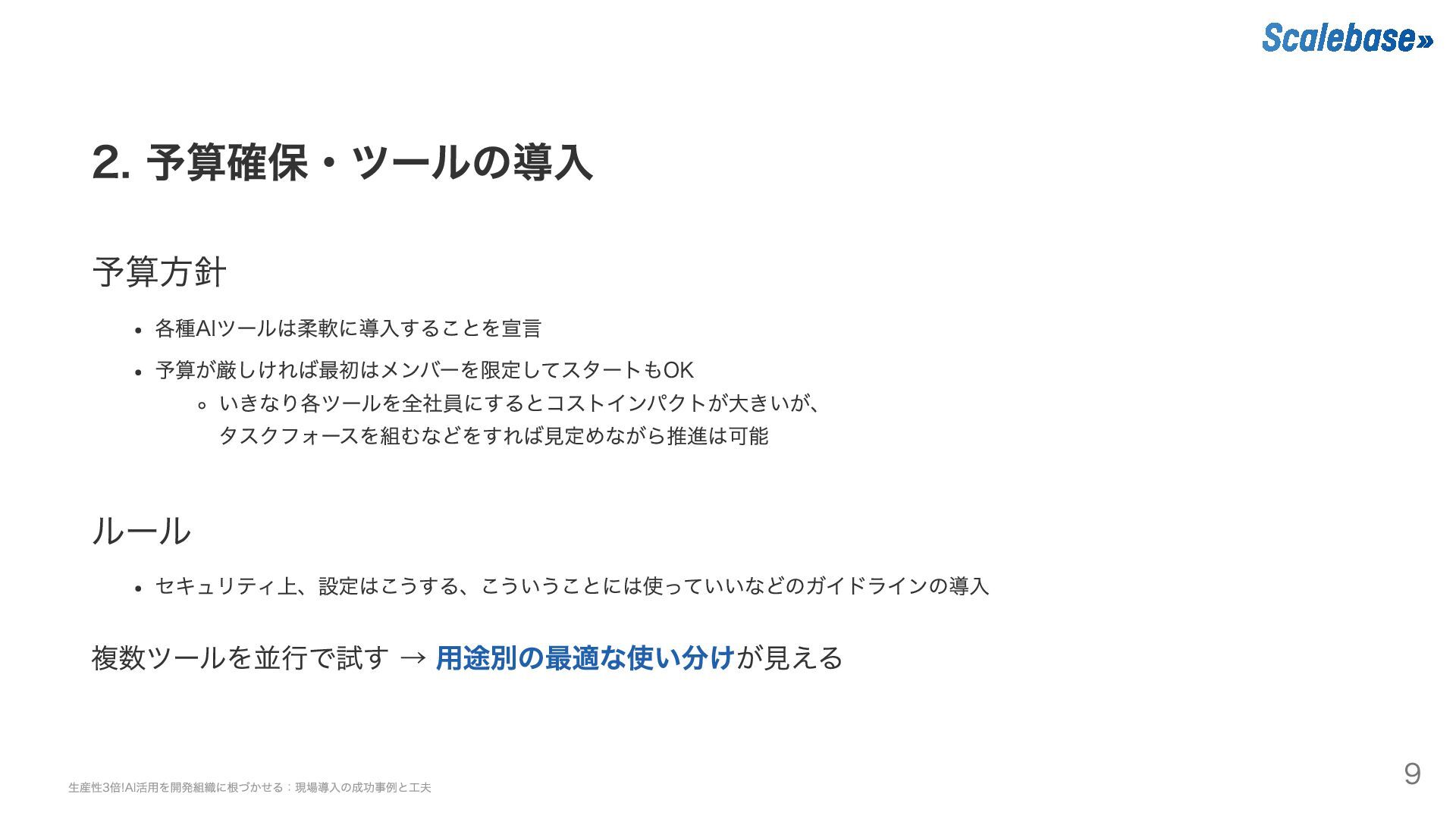 2. 予算確保・ツールの導入 予算方針 各種AIツールは柔軟に導入することを宣言 予算が厳しければ最初はメンバーを限定してスタートもOK いきなり各ツールを全社員にするとコストインパクトが大きいが、 タスクフォースを組むなどをすれば見定めながら推進は可能 ルール セキュリティ上、設定はこうする、こういうことには使っていいなどのガイドラインの導入 複数ツールを並行で試す