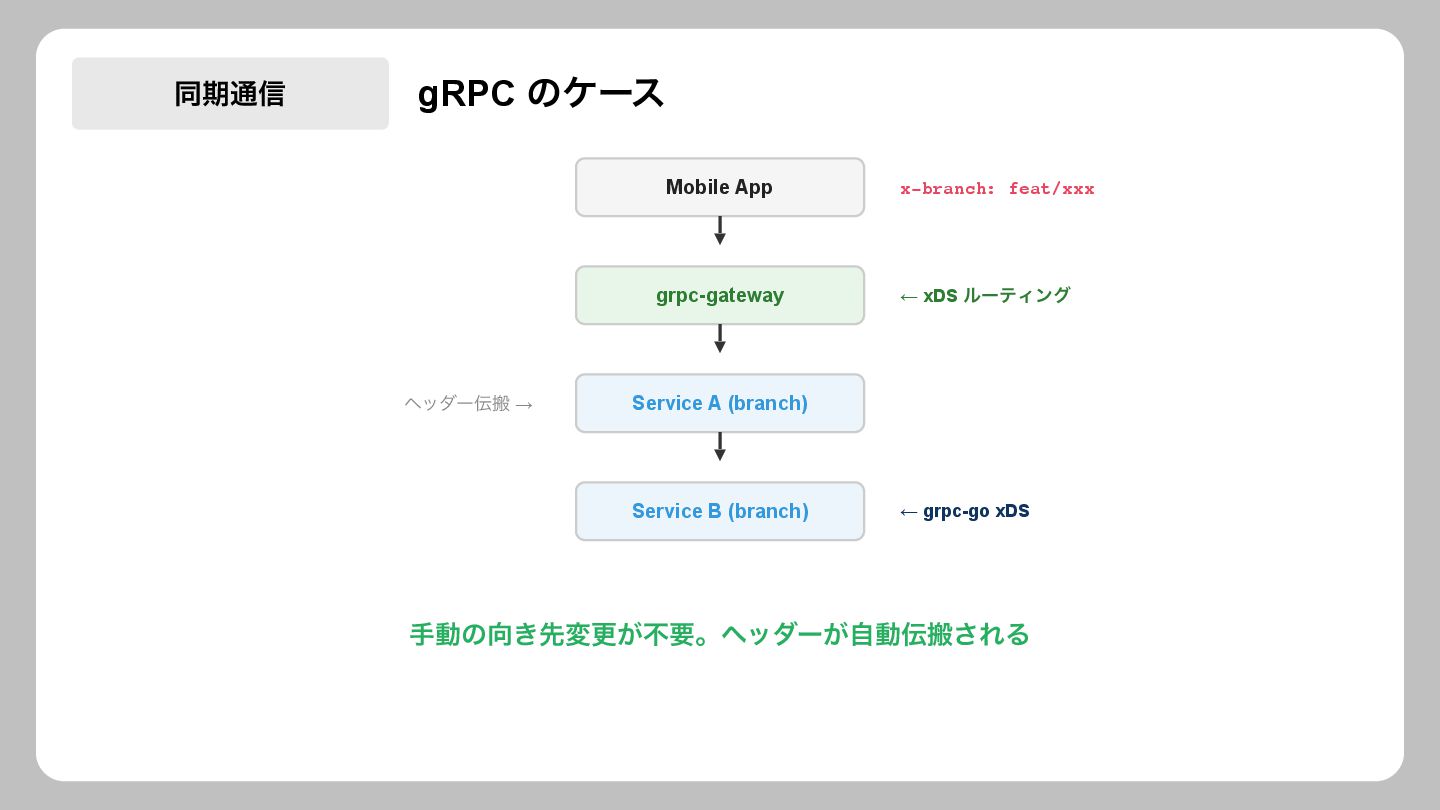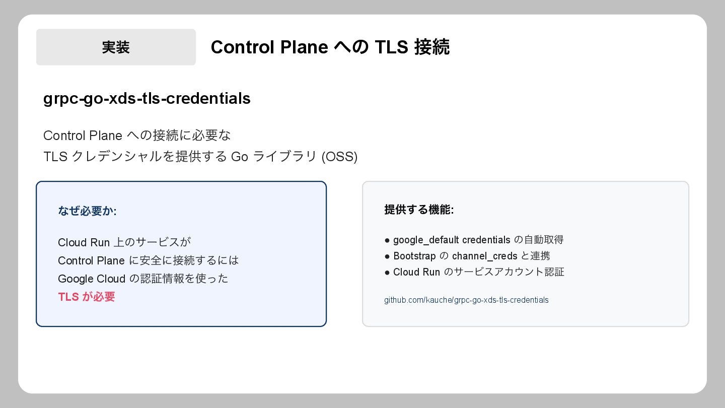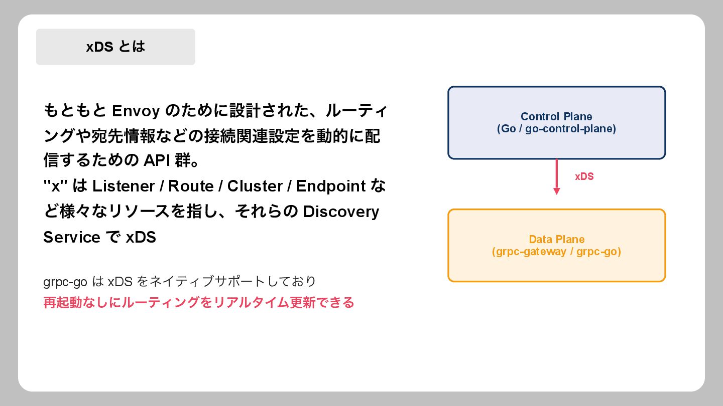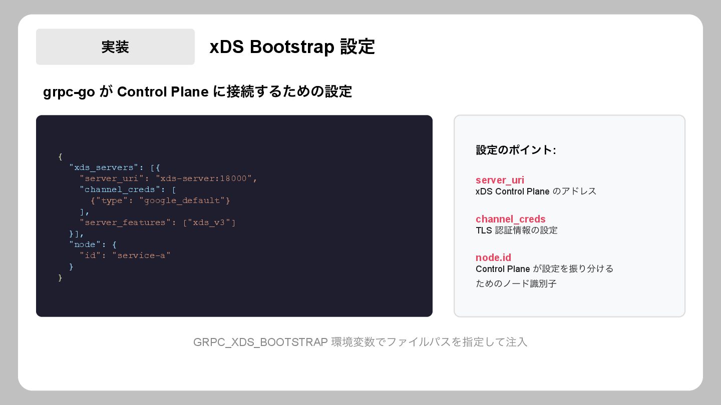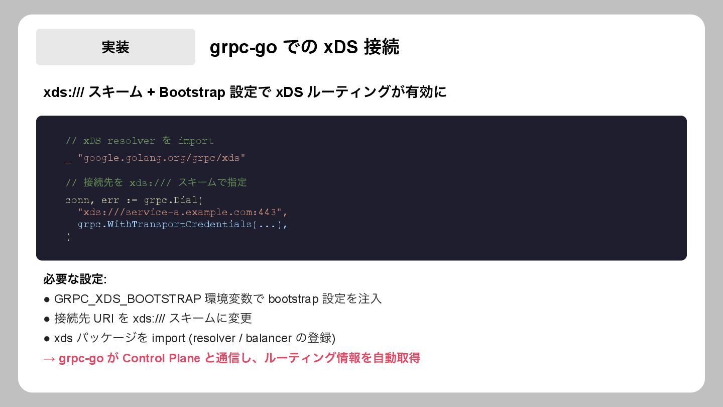 xDS ϧʔςΟϯά͕༗ޮʹ // xDS resolver Λ import _ "google.golang.org/grpc/xds" // ଓઌΛ xds:/// εΩʔϜͰࢦఆ conn, err := grpc.Dial( "xds:///service-a.example.com:443", grpc.WithTransportCredentials(...), ) ඞཁͳઃఆ: • GRPC_XDS_BOOTSTRAP ڥมͰ bootstrap ઃఆΛೖ • ଓઌ URI Λ xds:/// εΩʔϜʹมߋ • xds ύοέʔδΛ import (resolver / balancer ͷొ) → grpc-go ͕ Control Plane ͱ௨৴͠ɺϧʔςΟϯάใΛࣗಈऔಘ
