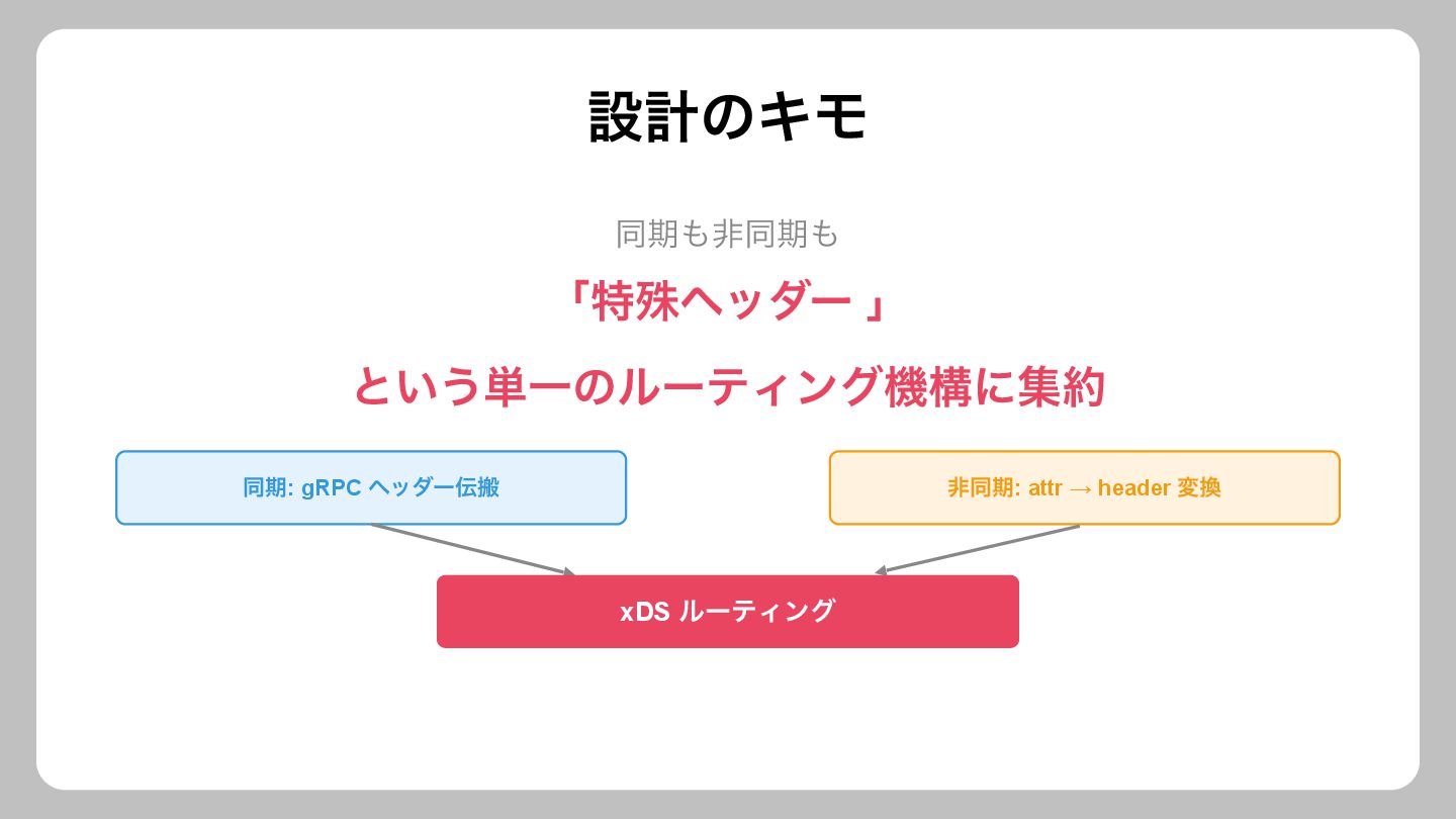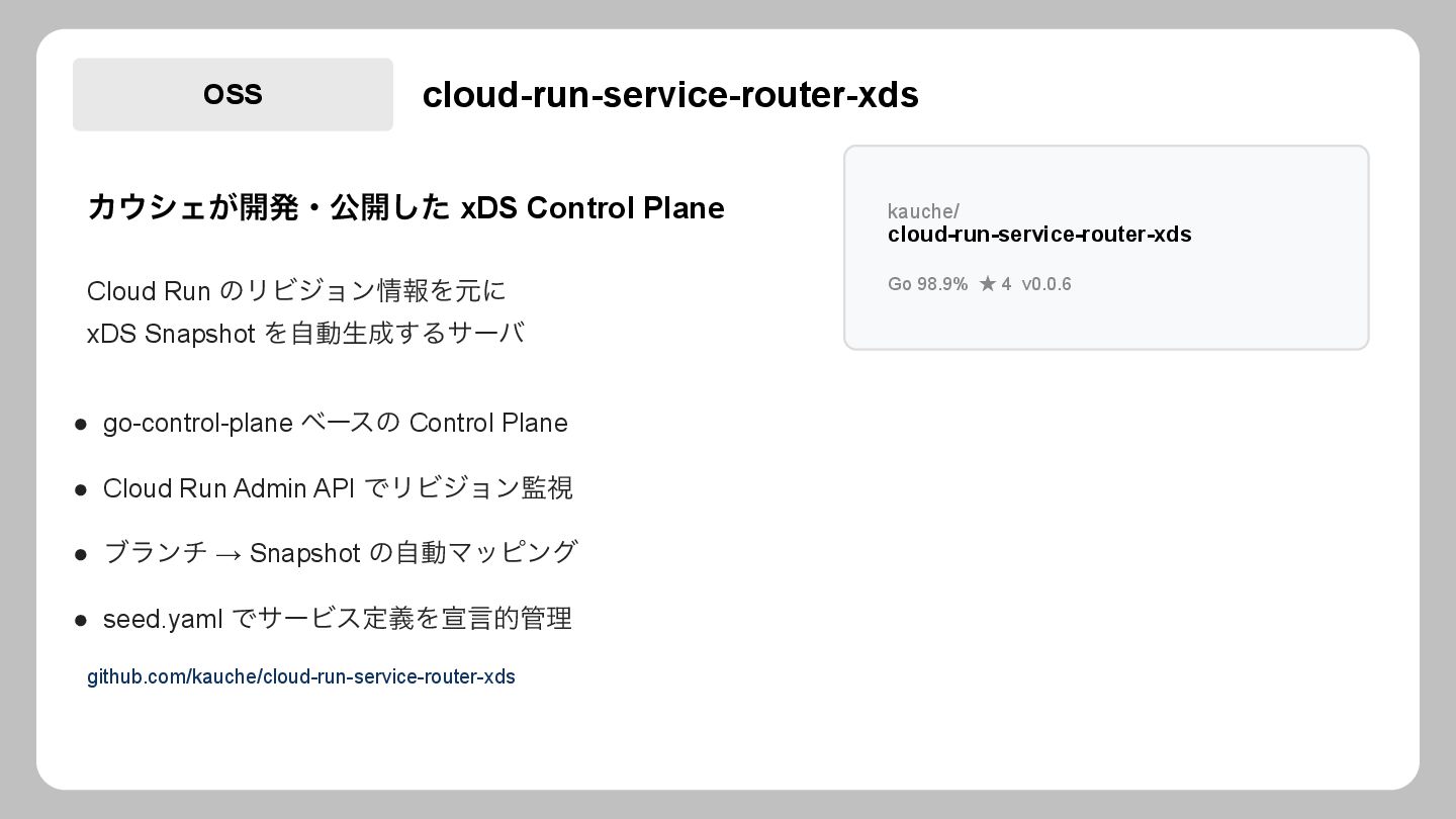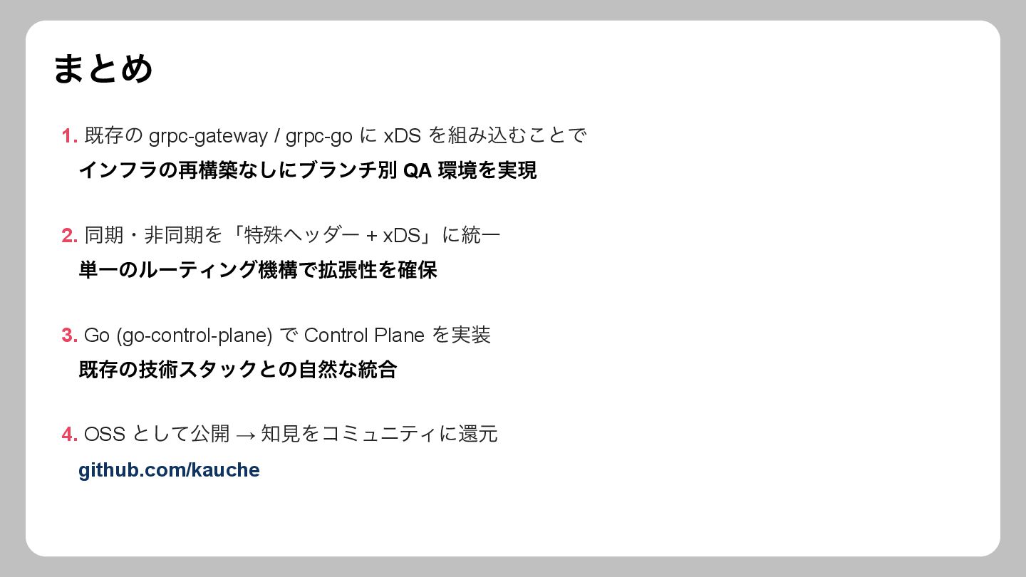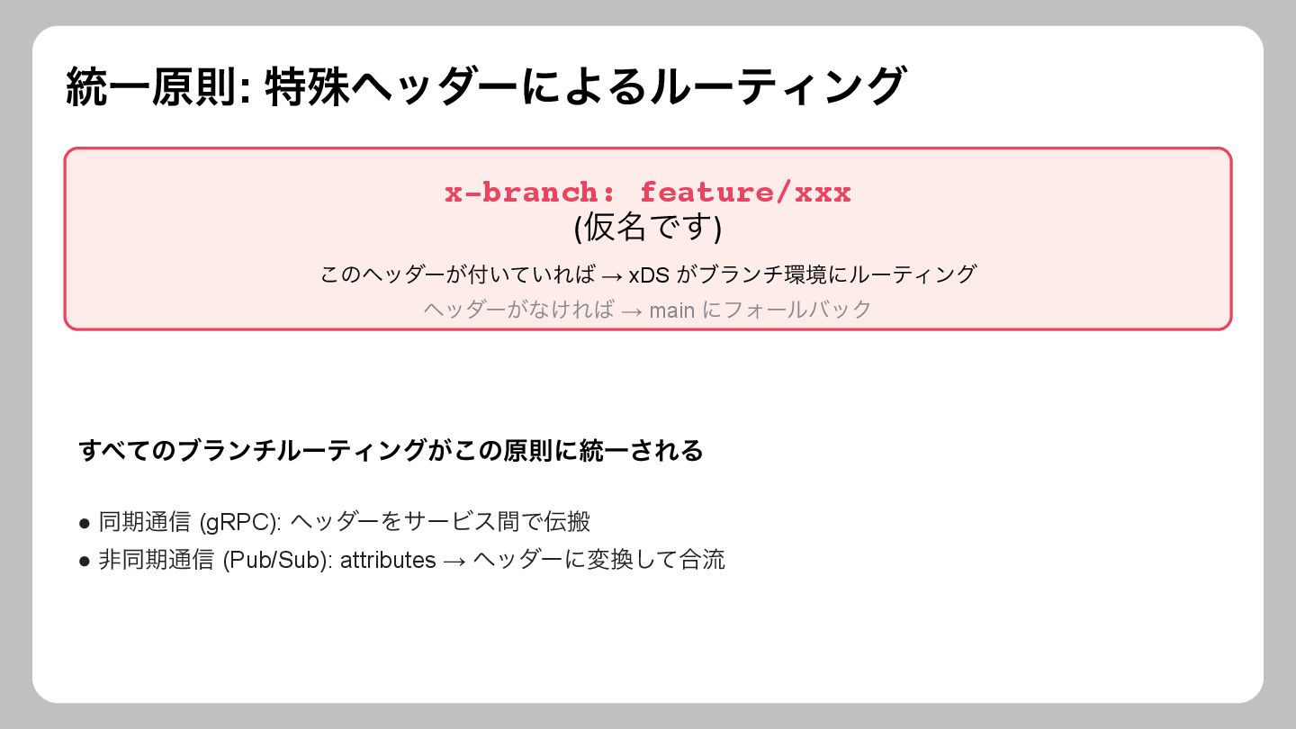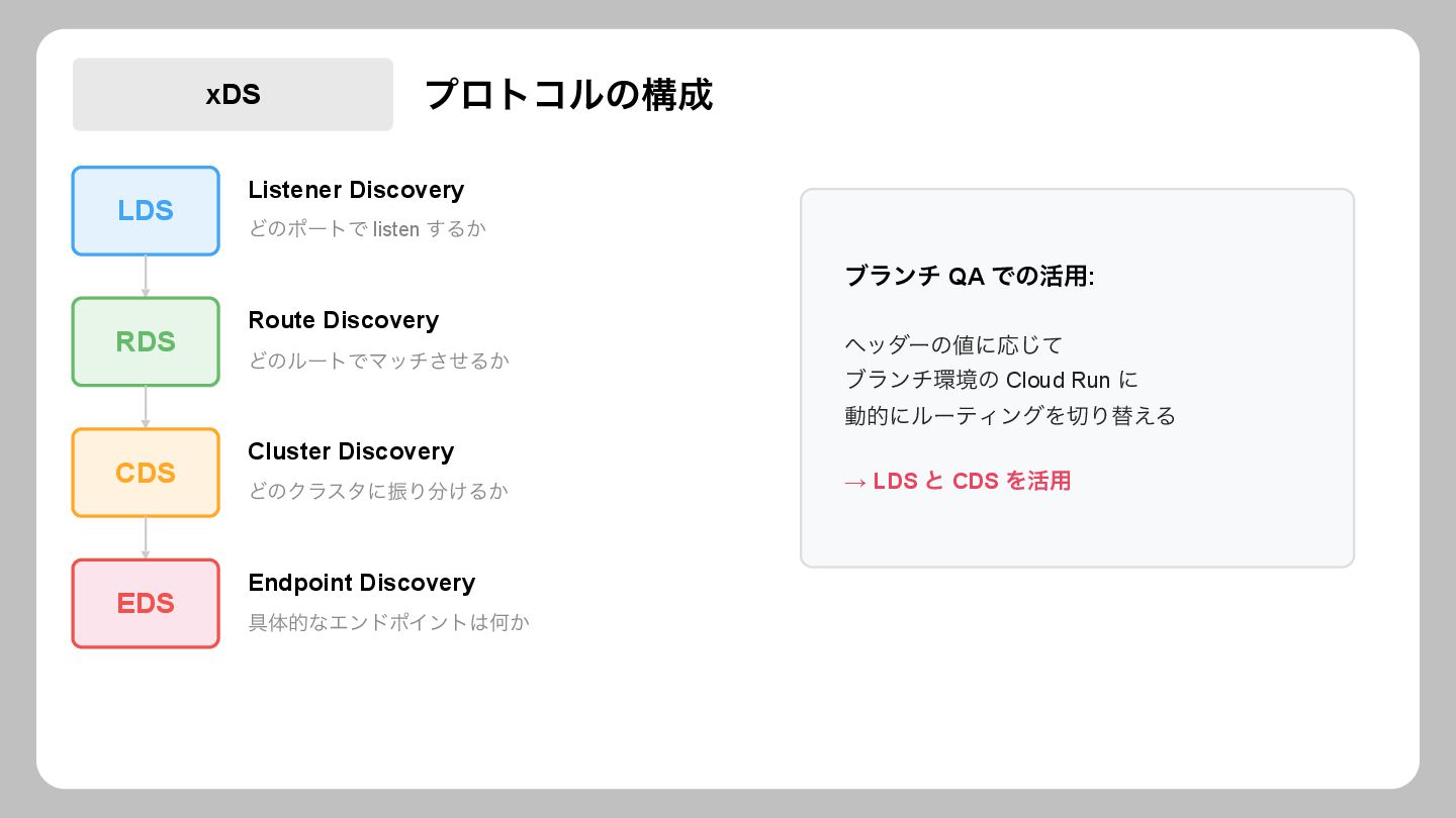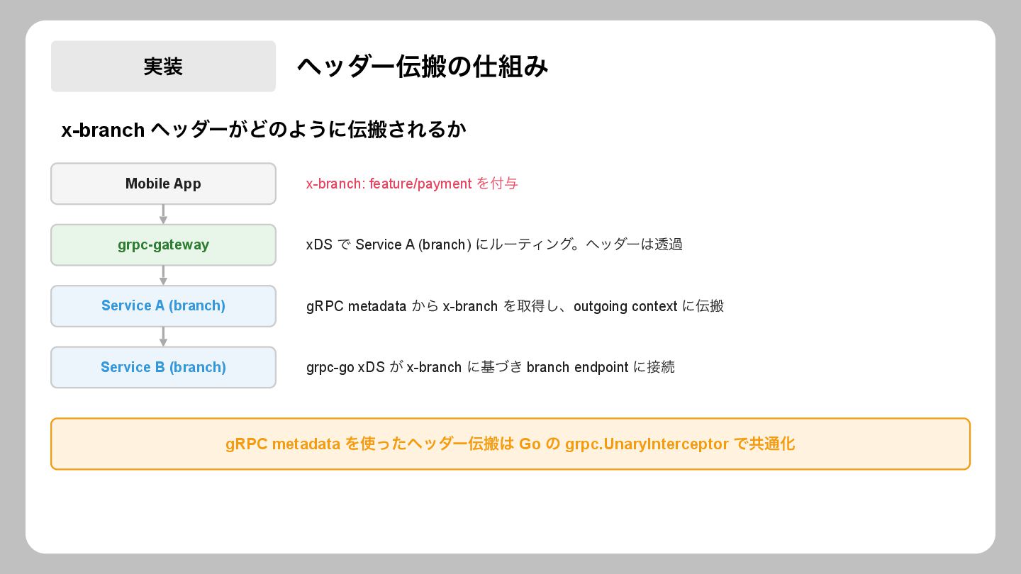 xDS ϧʔςΟϯά͕༗ޮʹ // xDS resolver Λ import _ "google.golang.org/grpc/xds" // ଓઌΛ xds:/// εΩʔϜͰࢦఆ conn, err := grpc.Dial( "xds:///service-a.example.com:443", grpc.WithTransportCredentials(...), ) ඞཁͳઃఆ: • GRPC_XDS_BOOTSTRAP ڥมͰ bootstrap ઃఆΛೖ • ଓઌ URI Λ xds:/// εΩʔϜʹมߋ • xds ύοέʔδΛ import (resolver / balancer ͷొ) → grpc-go ͕ Control Plane ͱ௨৴͠ɺϧʔςΟϯάใΛࣗಈऔಘ
