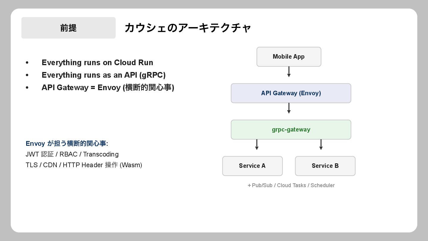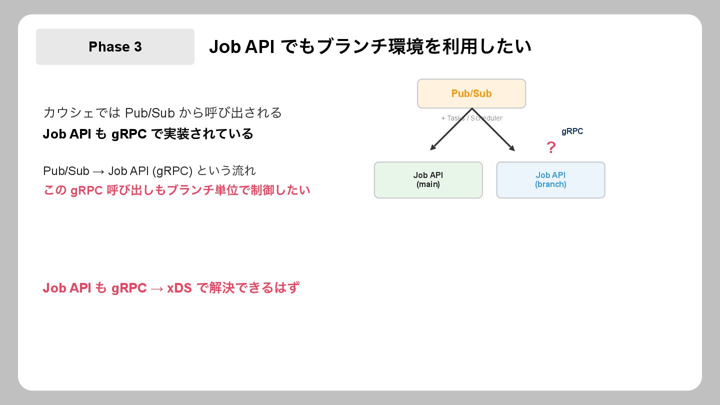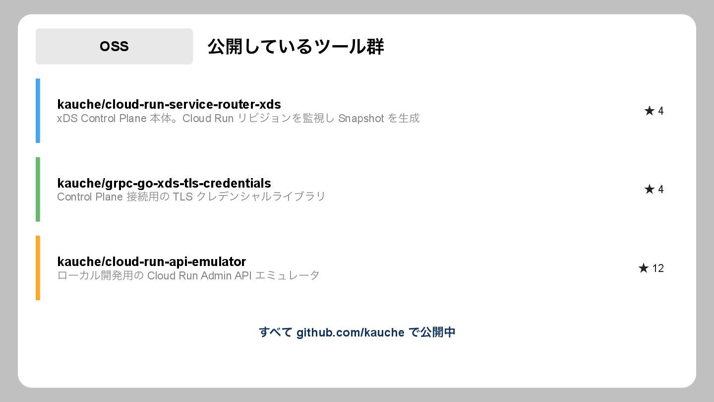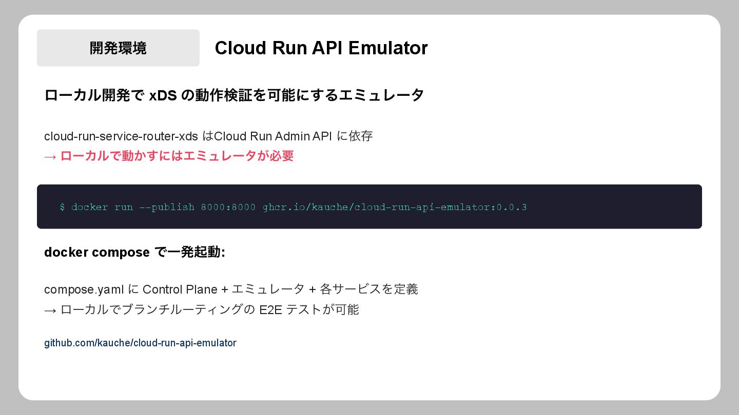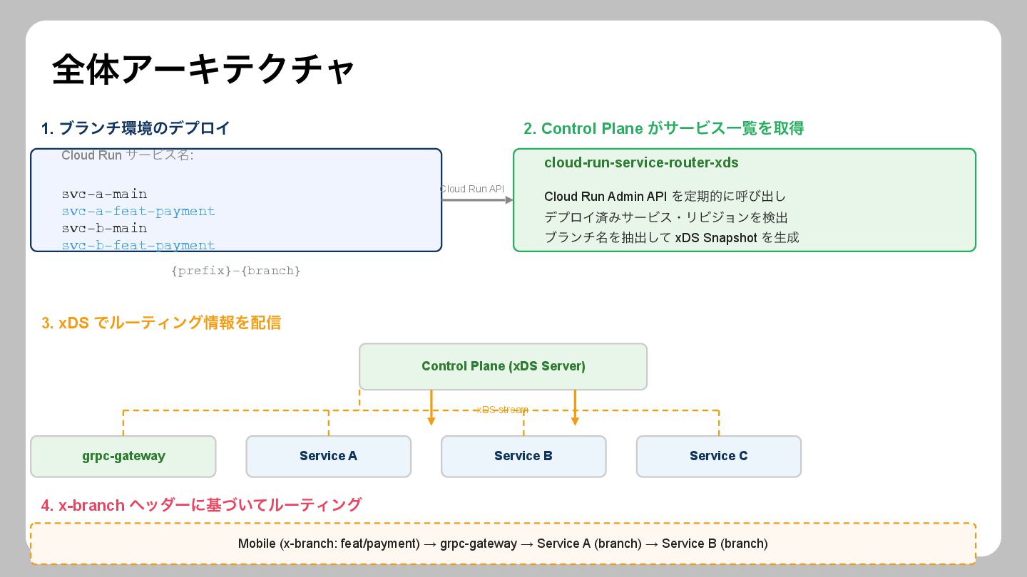 xDS ϧʔςΟϯά͕༗ޮʹ // xDS resolver Λ import _ "google.golang.org/grpc/xds" // ଓઌΛ xds:/// εΩʔϜͰࢦఆ conn, err := grpc.Dial( "xds:///service-a.example.com:443", grpc.WithTransportCredentials(...), ) ඞཁͳઃఆ: • GRPC_XDS_BOOTSTRAP ڥมͰ bootstrap ઃఆΛೖ • ଓઌ URI Λ xds:/// εΩʔϜʹมߋ • xds ύοέʔδΛ import (resolver / balancer ͷొ) → grpc-go ͕ Control Plane ͱ௨৴͠ɺϧʔςΟϯάใΛࣗಈऔಘ