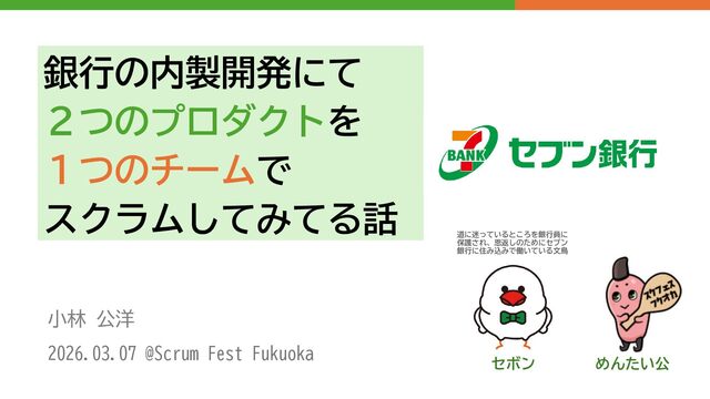 銀行の内製開発にて 2つのプロダクトを 1つのチームで スクラムしてみてる話 小林 公洋 2026.03.07 @Scrum Fest Fukuoka