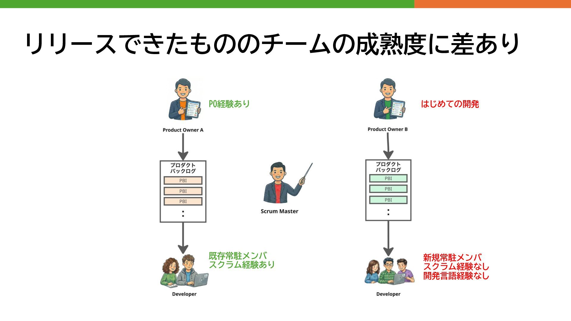 リリースできたもののチームの成熟度に差あり PO経験あり はじめての開発 既存常駐メンバ スクラム経験あり 新規常駐メンバ スクラム経験なし 開発言語経験なし