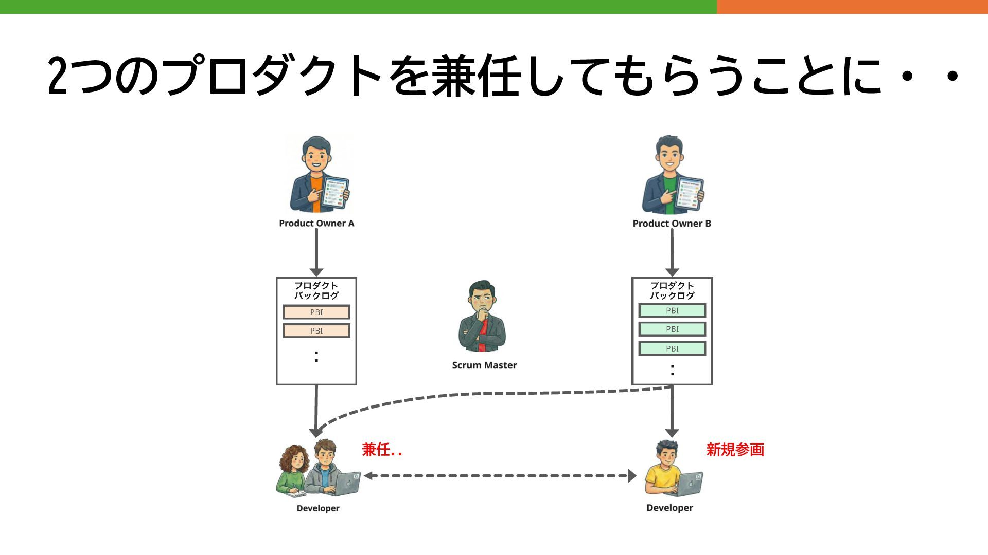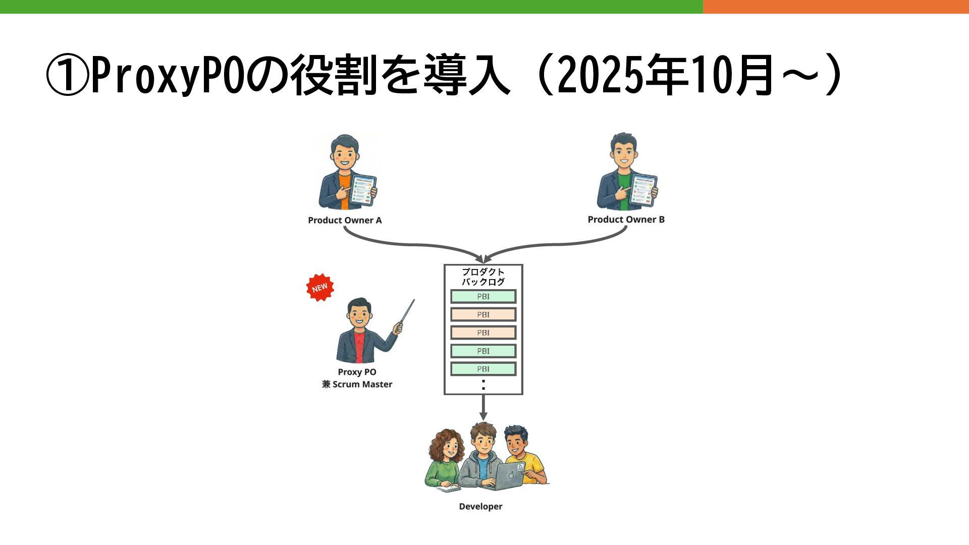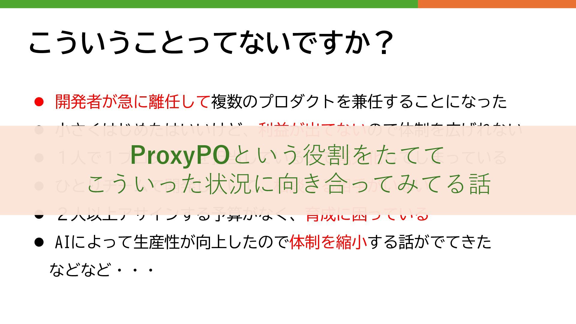 2人以上アサインする予算がなく、育成に困っている ⚫ AIによって生産性が向上したので体制を縮小する話がでてきた などなど・・・ ProxyPOという役割をたてて こういった状況に向き合ってみてる話
