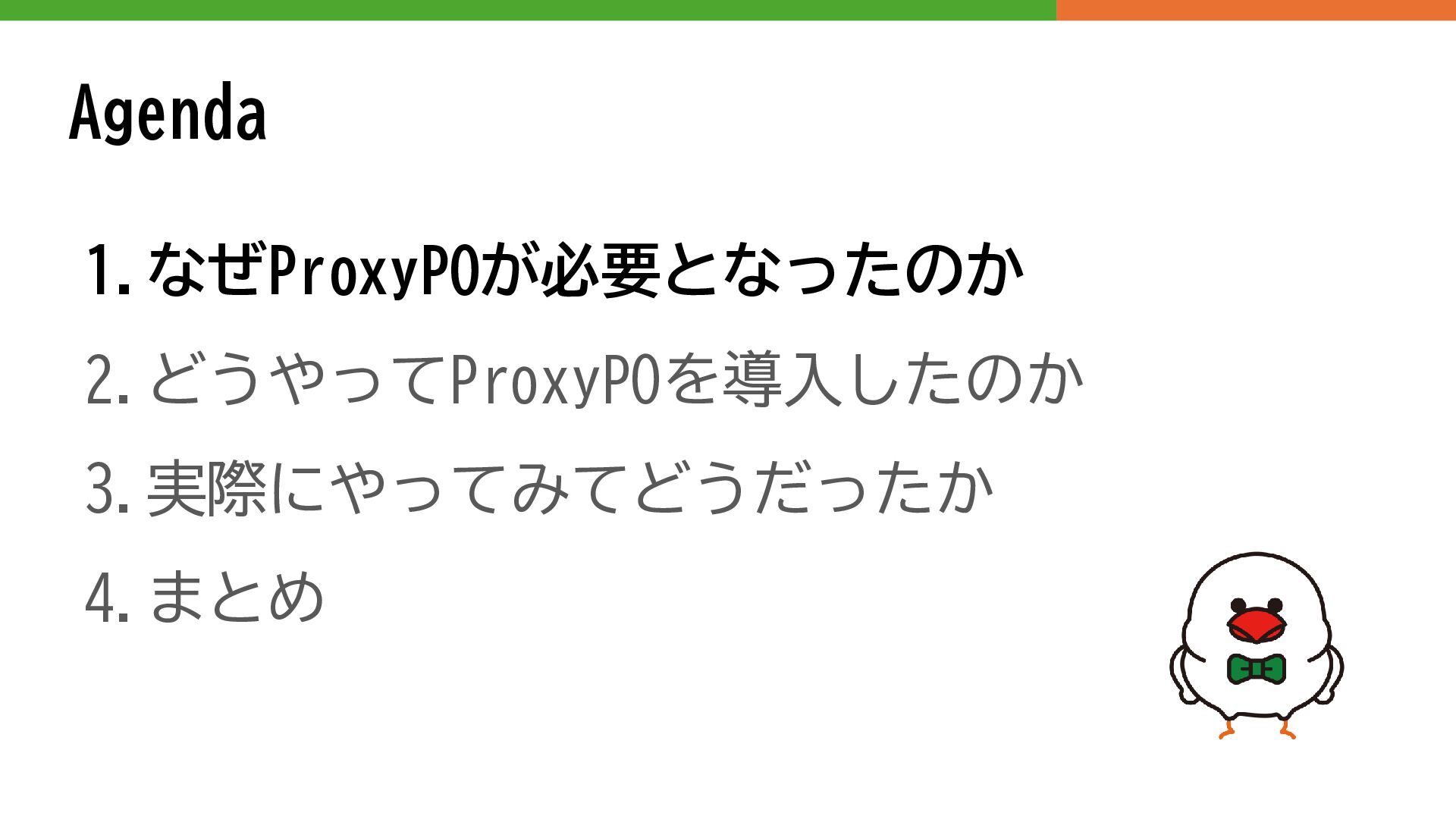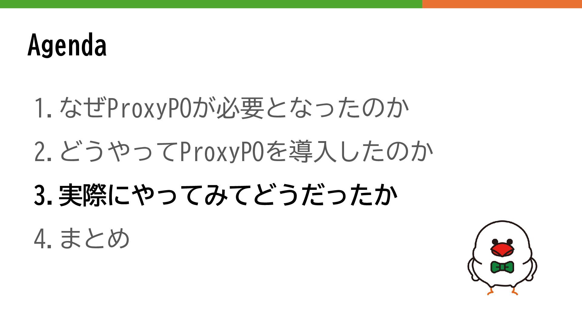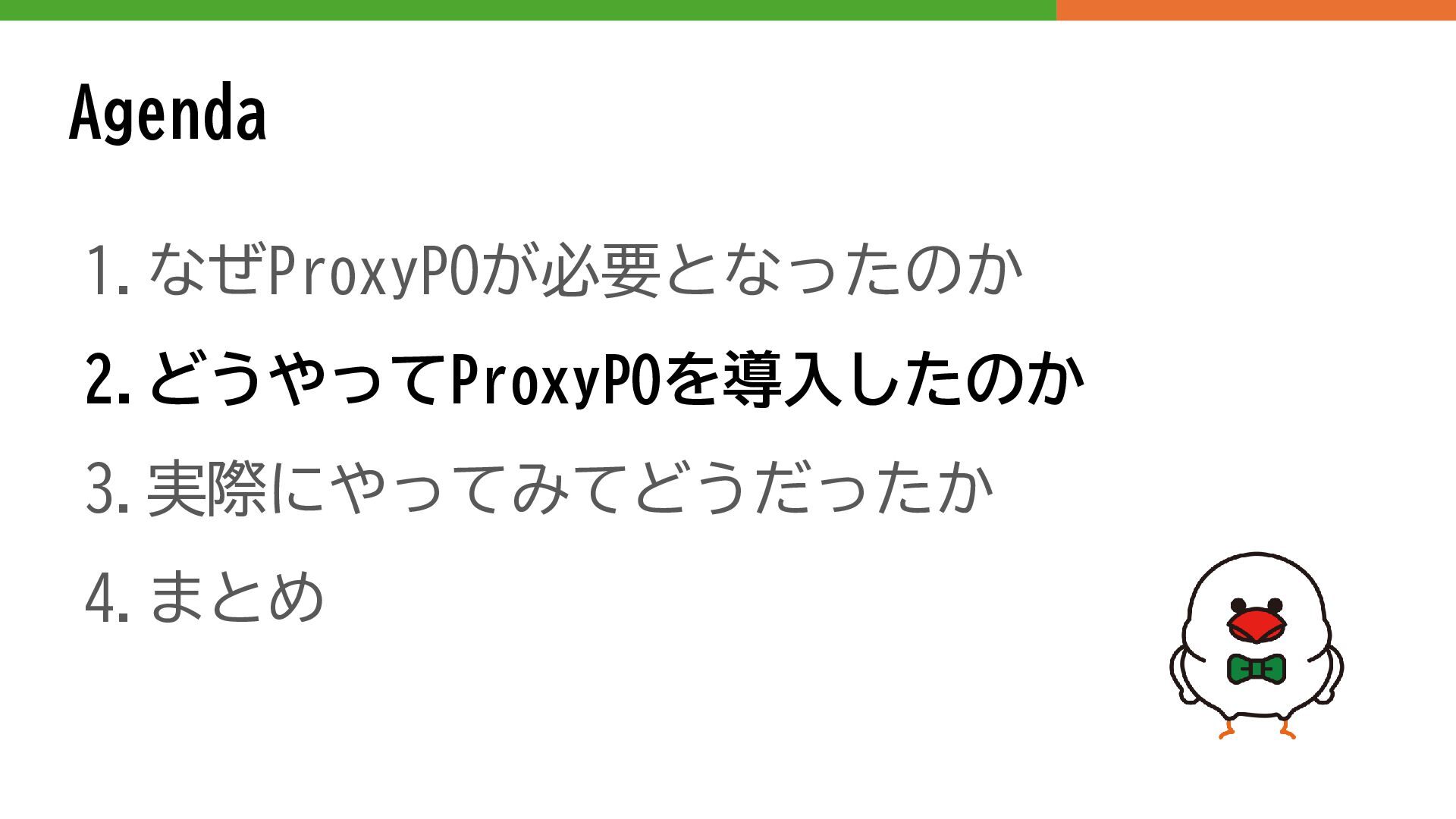 Agenda 1.なぜProxyPOが必要となったのか 2.どうやってProxyPOを導入したのか 3.実際にやってみてどうだったか 4.まとめ