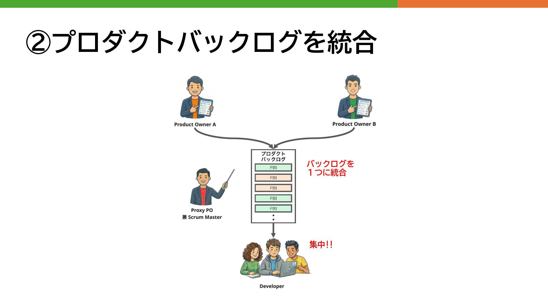 ②プロダクトバックログを統合 バックログを 1つに統合 集中!!