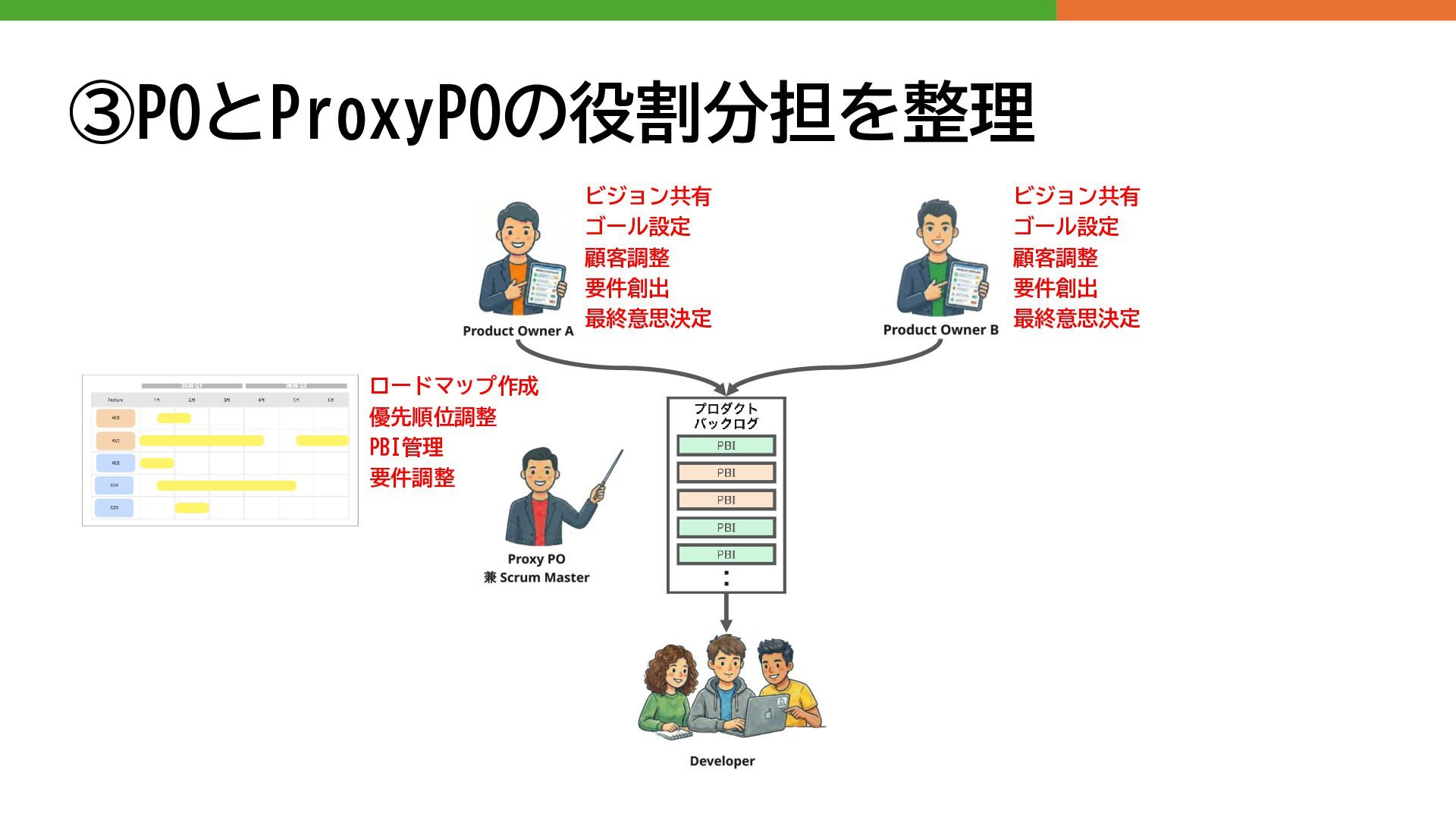 ③POとProxyPOの役割分担を整理 ビジョン共有 ゴール設定 顧客調整 要件創出 最終意思決定 ビジョン共有 ゴール設定 顧客調整 要件創出