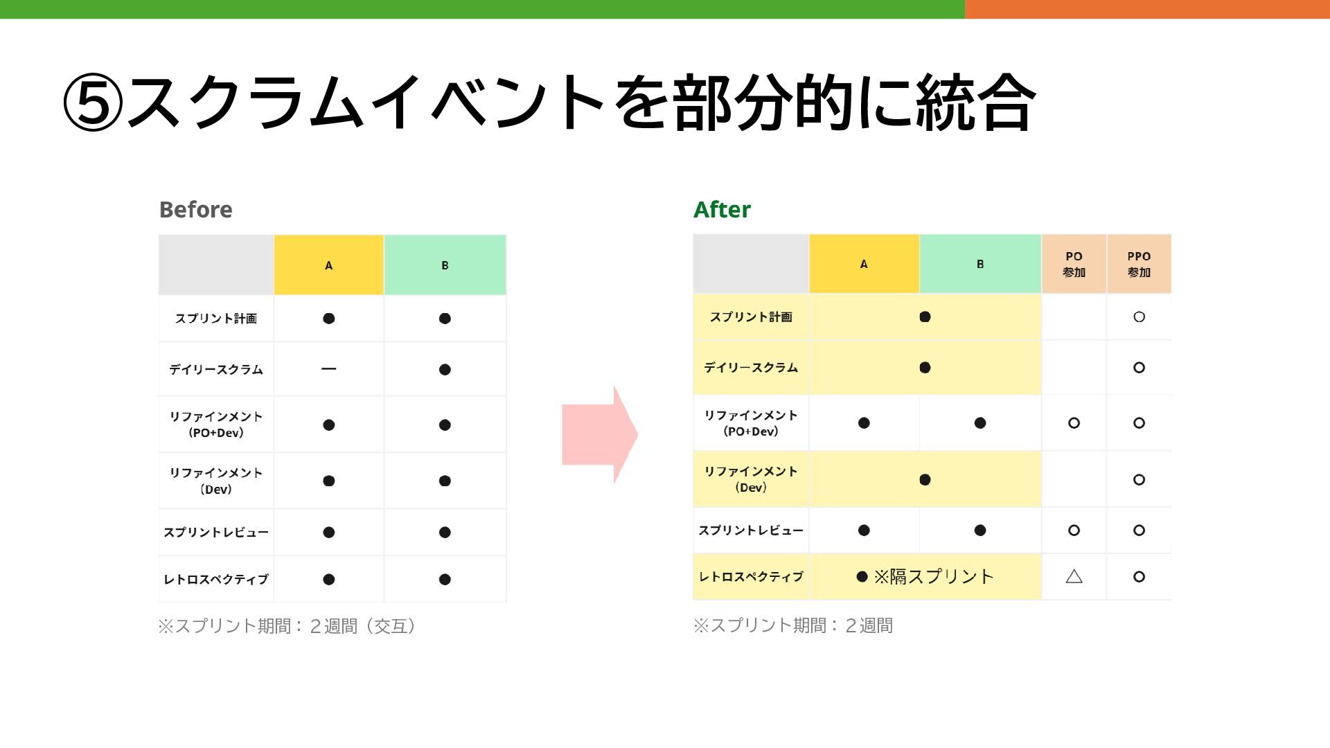 ⑤スクラムイベントを部分的に統合 ※スプリント期間:2週間(交互) ※スプリント期間:2週間
