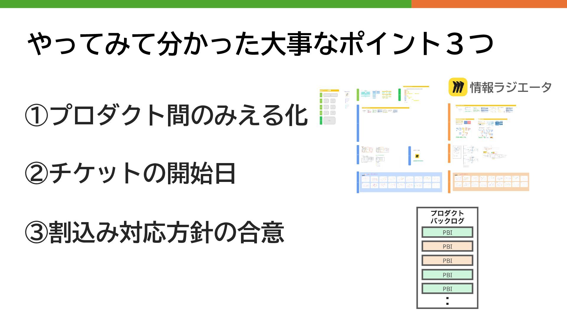 やってみて分かった大事なポイント3つ ①プロダクト間のみえる化 ②チケットの開始日 ③割込み対応方針の合意 情報ラジエータ