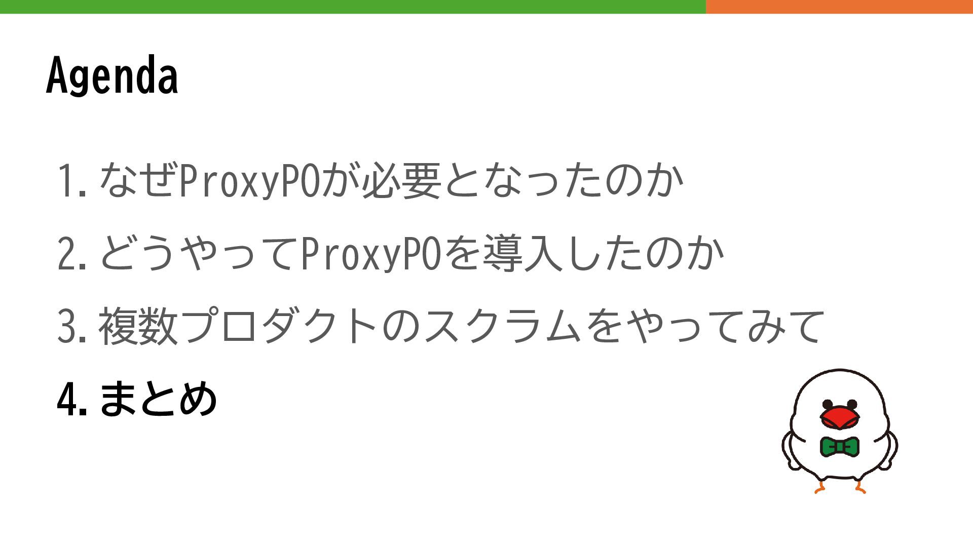 Agenda 1.なぜProxyPOが必要となったのか 2.どうやってProxyPOを導入したのか 3.複数プロダクトのスクラムをやってみて 4.まとめ