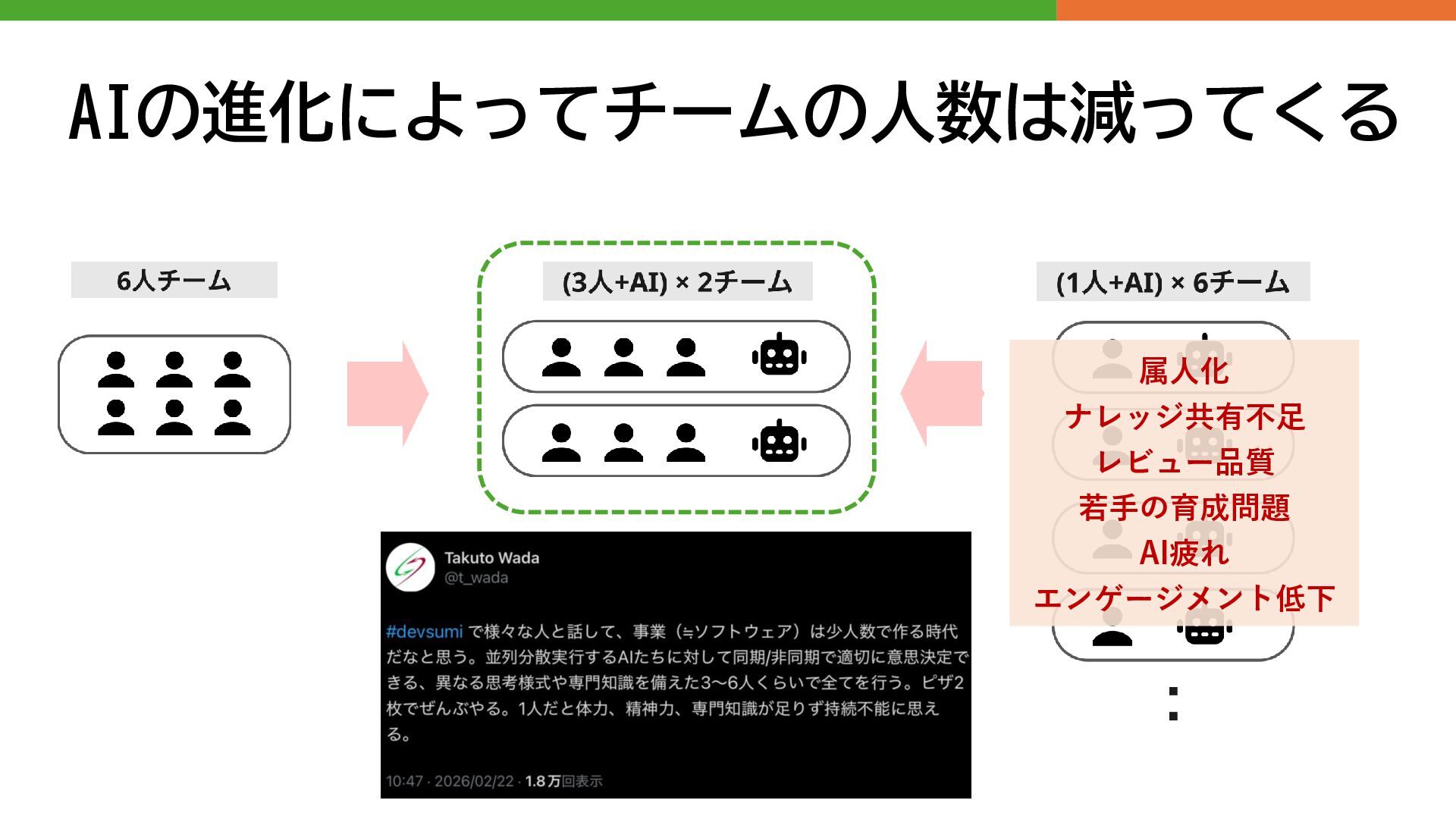 AIの進化によってチームの人数は減ってくる 属人化 ナレッジ共有不足 レビュー品質 若手の育成問題 AI疲れ エンゲージメント低下
