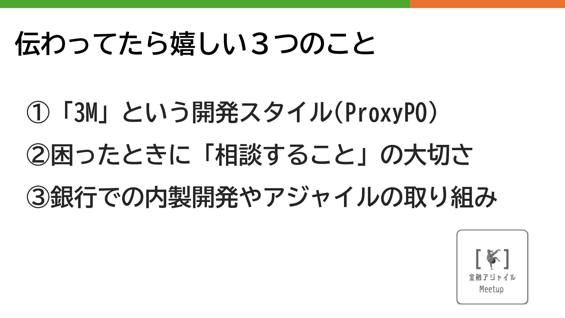 伝わってたら嬉しい3つのこと ①「3M」という開発スタイル(ProxyPO) ②困ったときに「相談すること」の大切さ ③銀行での内製開発やアジャイルの取り組み