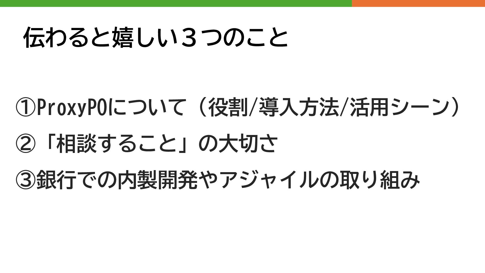 伝わると嬉しい3つのこと ①ProxyPOについて (役割/導入方法/活用シーン) ②「相談すること」の大切さ ③銀行での内製開発やアジャイルの取り組み