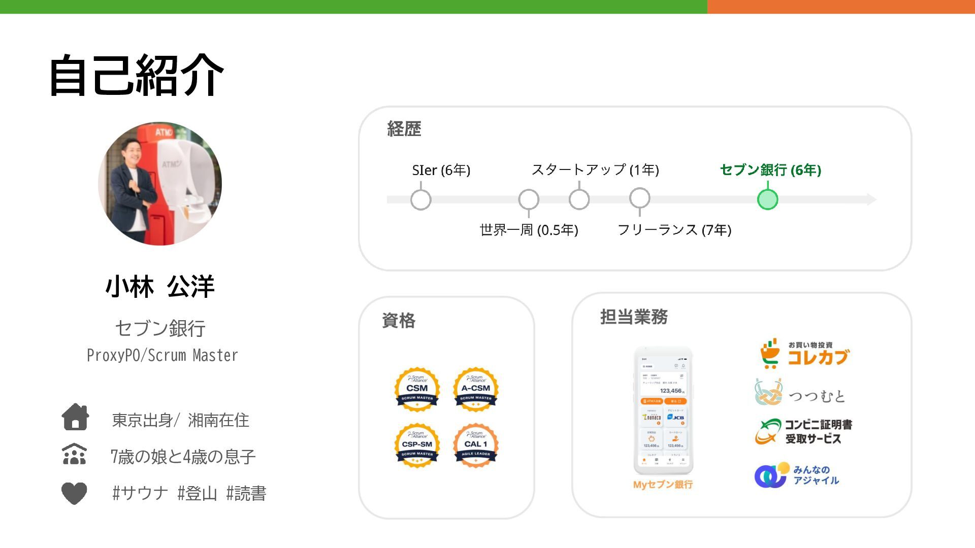 自己紹介 小林 公洋 セブン銀行 ProxyPO/Scrum Master 東京出身/ 湘南在住 7歳の娘と4歳の息子 #サウナ