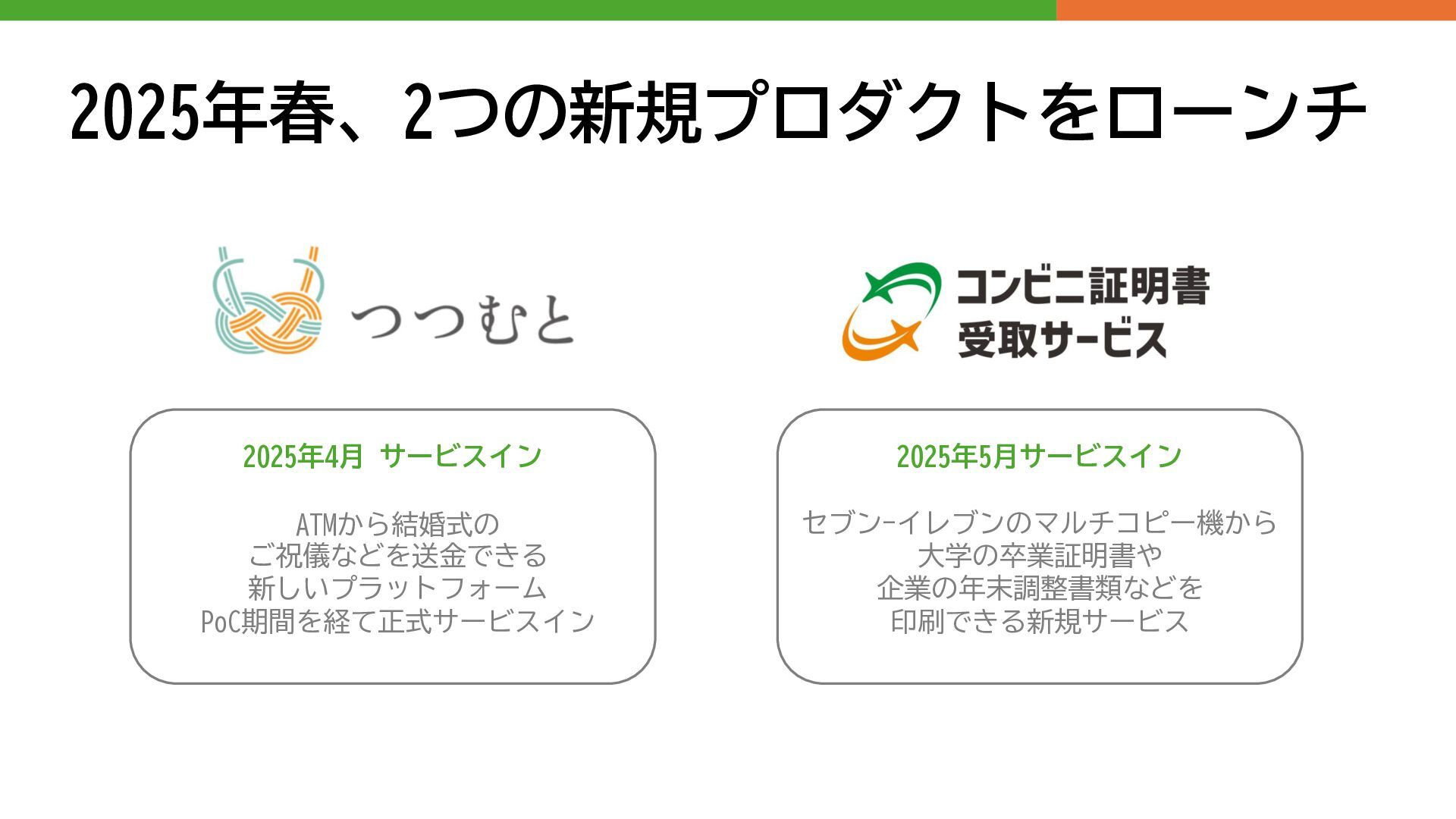 2025年春、2つの新規プロダクトをローンチ 2025年4月 サービスイン ATMから結婚式の ご祝儀などを送金できる 新しいプラットフォーム PoC期間を経て正式サービスイン セブン-イレブンのマルチコピー機から 大学の卒業証明書や 企業の年末調整書類などを