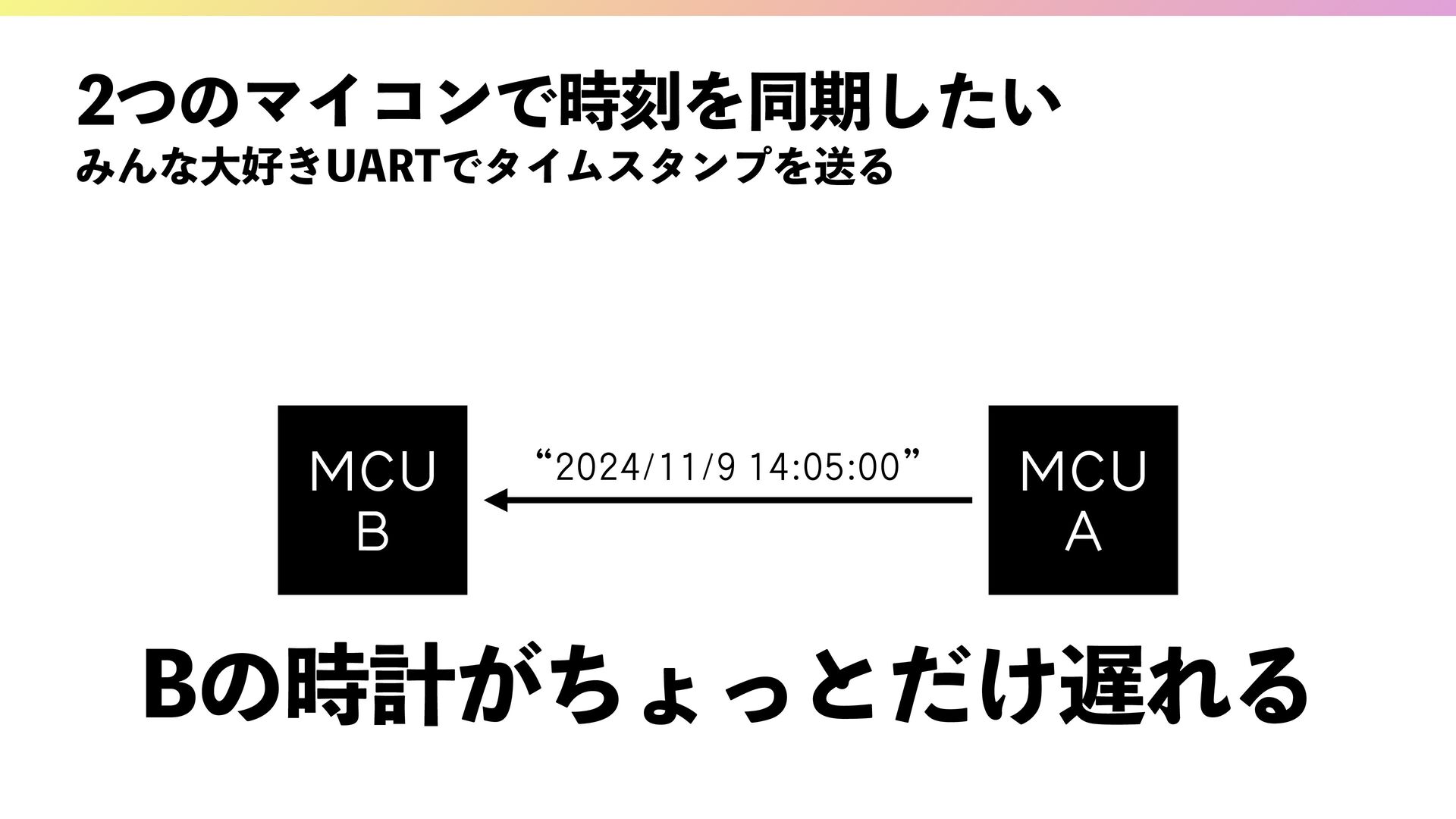 ͭͷϚΠίϯͰ࣌ࠁΛಉظ͍ͨ͠ ΈΜͳେ͖6"35ͰλΠϜελϯϓΛૹΔ #ͷ࣌ܭ͕ͪΐͬͱ͚ͩΕΔ .$6 # .$6 " lz ͳ͔ͥʁ