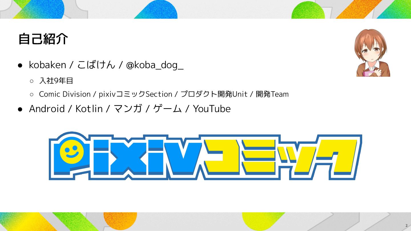 Comic Division / pixivコミックSection / プロダクト開発Unit / 開発Team • Android / Kotlin / マンガ / ゲーム / YouTube 2