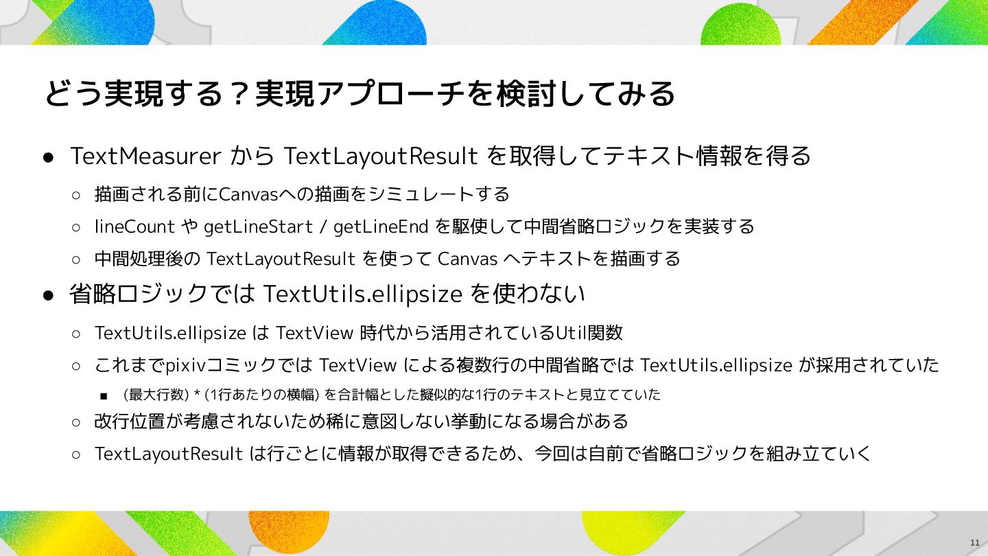 や getLineStart / getLineEnd を駆使して中間省略ロジックを実装する ◦ 中間処理後の TextLayoutResult を使って Canvas へテキストを描画する • 省略ロジックでは TextUtils.ellipsize を使わない ◦ TextUtils.ellipsize は TextView 時代から活用されているUtil関数 ◦ これまでpixivコミックでは TextView による複数行の中間省略では TextUtils.ellipsize が採用されていた ▪ (最大行数) * (1行あたりの横幅) を合計幅とした擬似的な1行のテキストと見立てていた ◦ 改行位置が考慮されないため稀に意図しない挙動になる場合がある ◦ TextLayoutResult は行ごとに情報が取得できるため、今回は自前で省略ロジックを組み立ていく 11