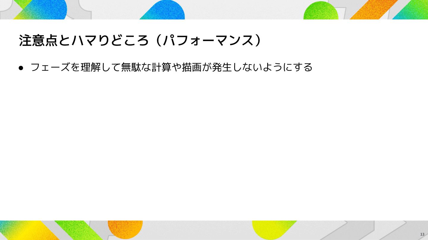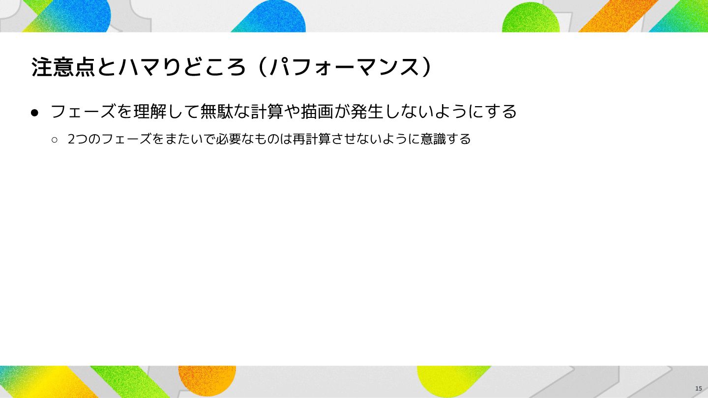 注意点とハマりどころ(パフォーマンス) • フェーズを理解して無駄な計算や描画が発生しないようにする 13