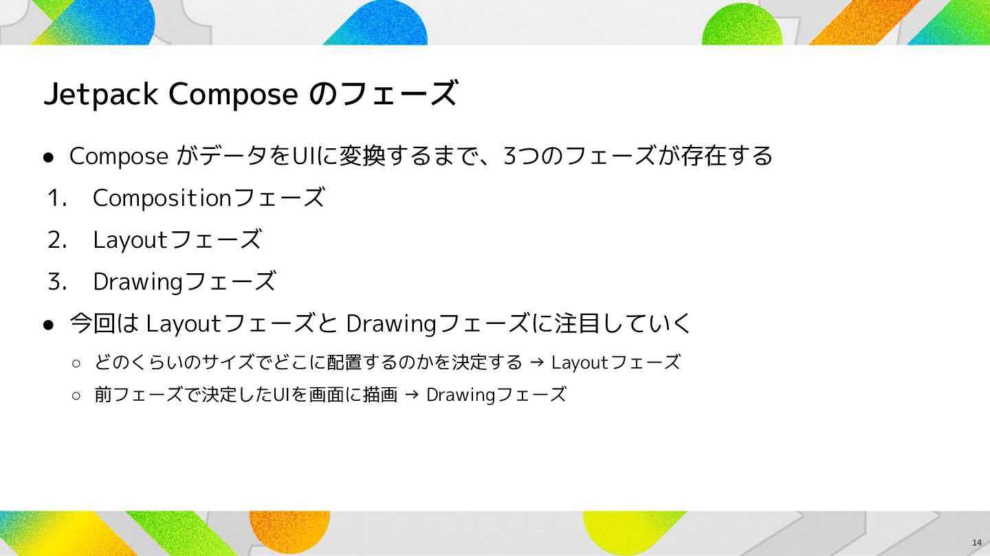 Jetpack Compose のフェーズ • Compose がデータをUIに変換するまで、3つのフェーズが存在する 1. Compositionフェーズ 2. Layoutフェーズ