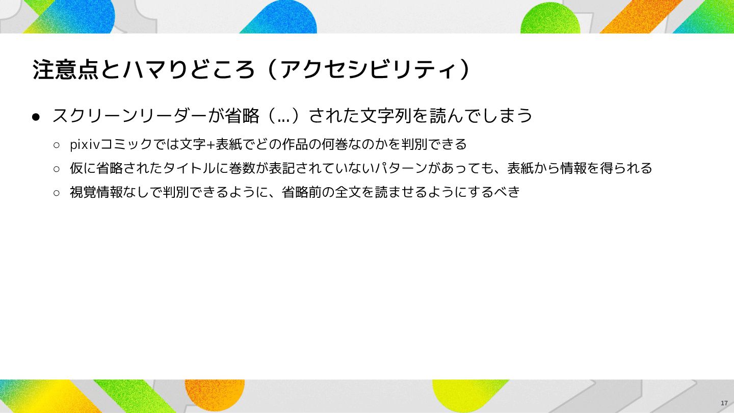 注意点とハマりどころ(アクセシビリティ) • スクリーンリーダーが省略(...)された文字列を読んでしまう ◦ pixivコミックでは文字+表紙でどの作品の何巻なのかを判別できる ◦ 仮に省略されたタイトルに巻数が表記されていないパターンがあっても、表紙から情報を得られる ◦ 視覚情報なしで判別できるように、省略前の全文を読ませるようにするべき 17