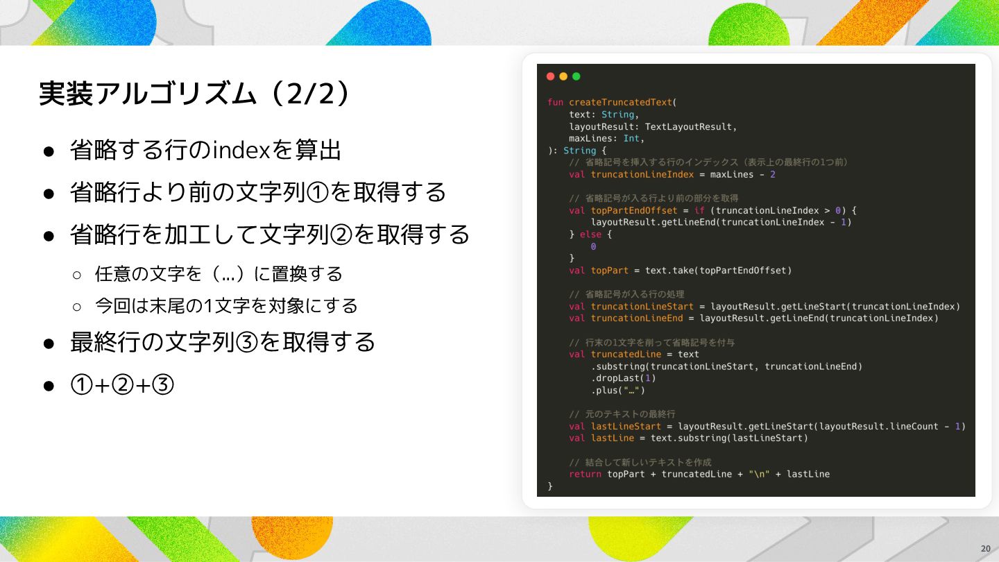 実装アルゴリズム(1/2) 19 1. テキストを TextMeasurer で計測 して TextLayoutResult を取得 2.