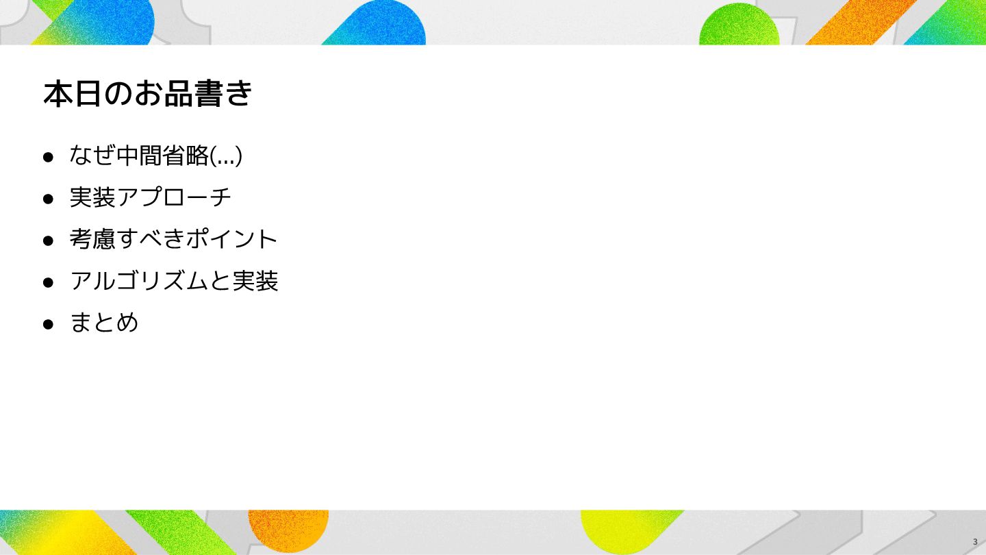 本日のお品書き • なぜ中間省略(...)が必要なのか? • 実装アプローチ • 考慮すべきポイント • アルゴリズムと実装 •