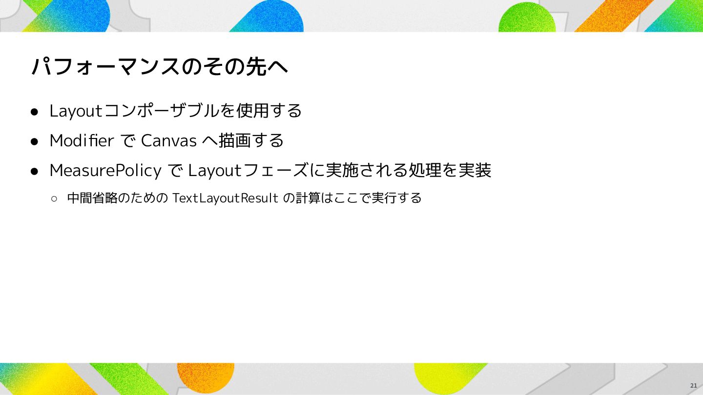 パフォーマンスのその先へ • Layoutコンポーザブルを使用する • Modifier で Canvas へ描画する • MeasurePolicy