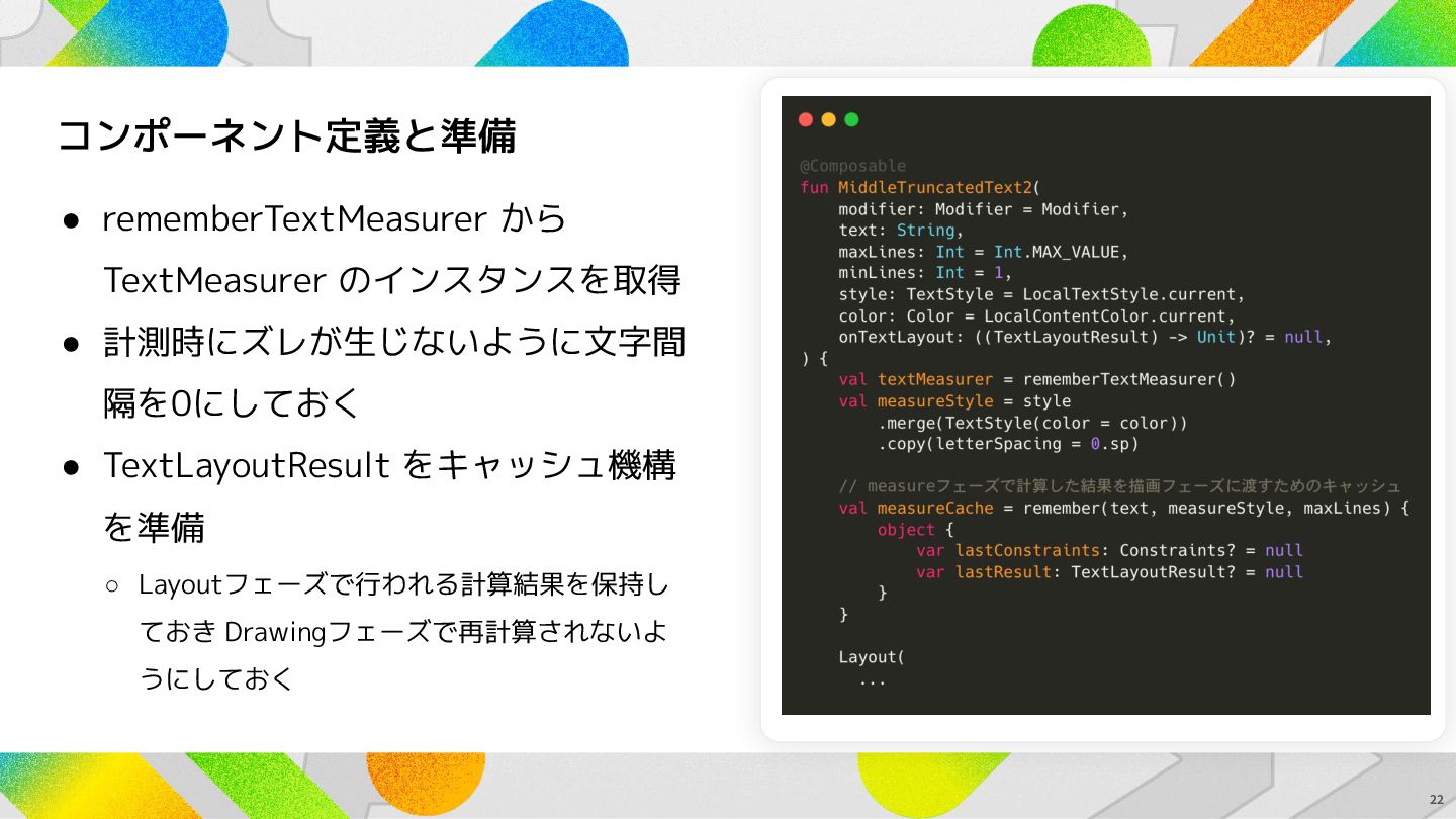 で Layoutフェーズに実施される処理を実装 ◦ 中間省略のための TextLayoutResult の計算はここで実行する 21