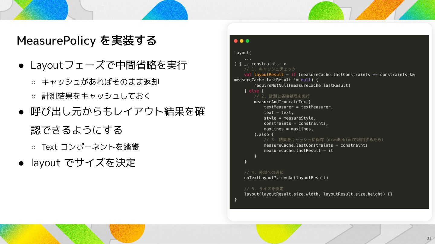 MeasurePolicy を実装する 23 • Layoutフェーズで中間省略を実行 ◦ キャッシュがあればそのまま返却 ◦ 計測結果をキャッシュしておく •
