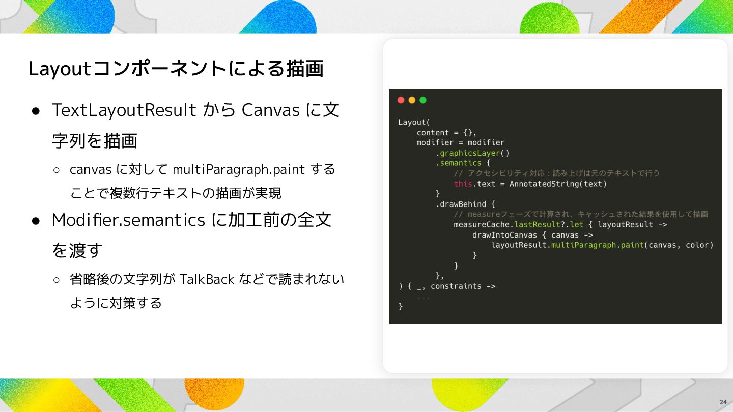 に対して multiParagraph.paint する ことで複数行テキストの描画が実現 • Modifier.semantics に加工前の全文 を渡す ◦ 省略後の文字列が TalkBack などで読まれない ように対策する