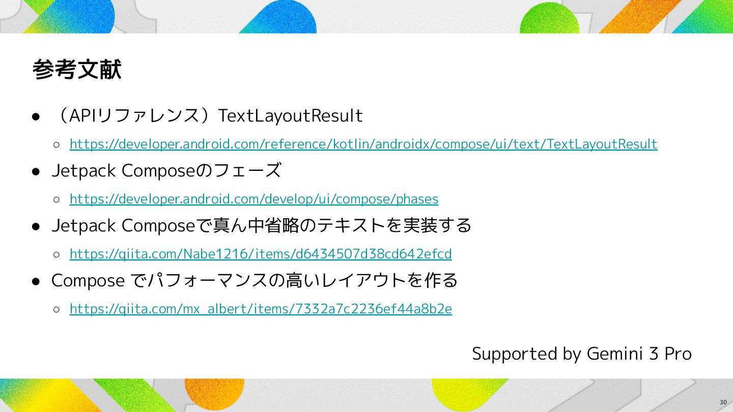 • Jetpack Composeで真ん中省略のテキストを実装する ◦ https://qiita.com/Nabe1216/items/d6434507d38cd642efcd • Compose でパフォーマンスの高いレイアウトを作る ◦ https://qiita.com/mx_albert/items/7332a7c2236ef44a8b2e 30 Supported by Gemini 3 Pro