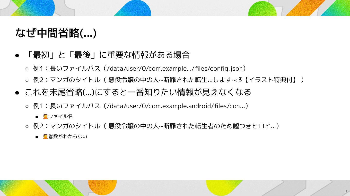 なぜ中間省略(...)が必要なのか? • 「最初」と「最後」に重要な情報がある場合 ◦ 例1:長いファイルパス(/data/user/0/com.example.../files/config.json) ◦ 例2:マンガのタイトル( 悪役令嬢の中の人~断罪された転生...します~:3【イラスト特典付】 ) •