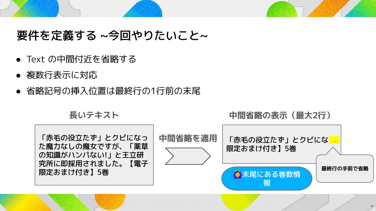 要件を定義する ~今回やりたいこと~ • Text の中間付近を省略する • 複数行表示に対応 • 省略記号の挿入位置は最終行の1行前の末尾 6
