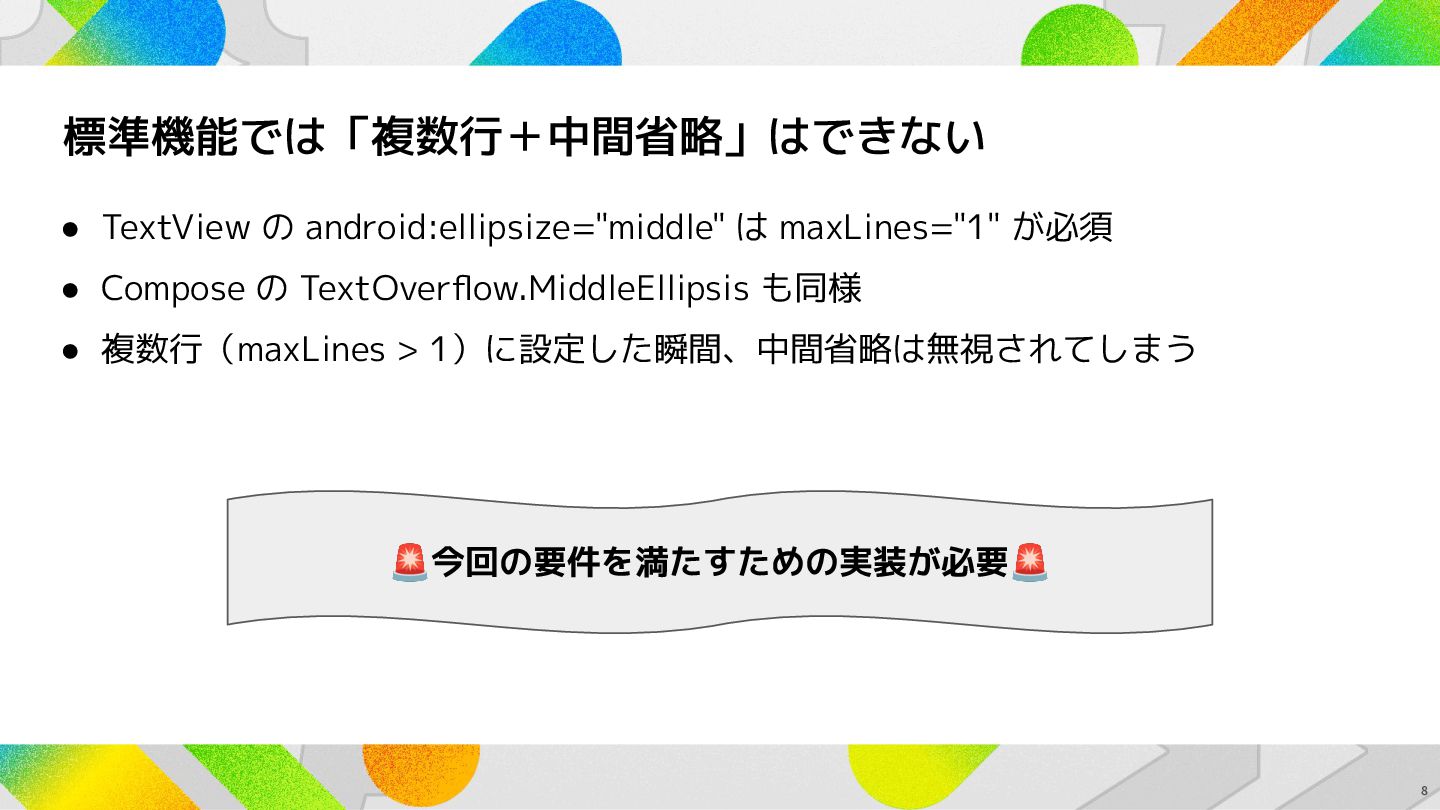 の TextOverflow.MiddleEllipsis も同様 • 複数行(maxLines > 1)に設定した瞬間、中間省略は無視されてしまう 8 🚨今回の要件を満たすための実装が必要🚨