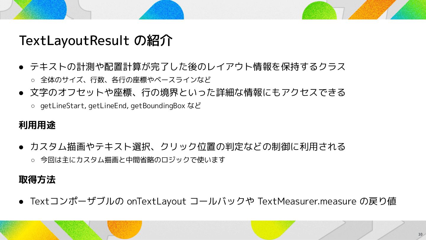 getLineEnd, getBoundingBox など 利用用途 • カスタム描画やテキスト選択、クリック位置の判定などの制御に利用される ◦ 今回は主にカスタム描画と中間省略のロジックで使います 取得方法 • Textコンポーザブルの onTextLayout コールバックや TextMeasurer.measure の戻り値 10