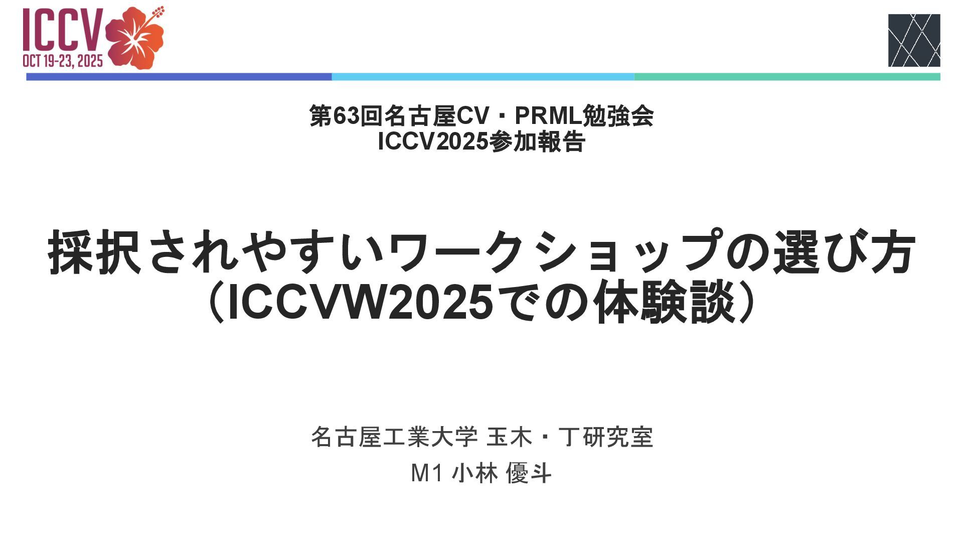 第63回名古屋CV・PRML勉強会 ICCV2025参加報告 採択されやすいワークショップの選び方 (ICCVW2025での体験談) 名古屋工業大学 玉木・丁研究室 M1 小林 優斗
