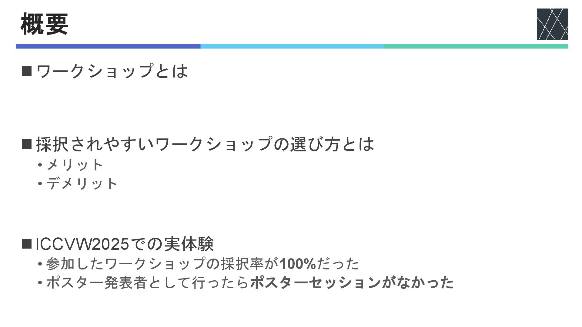 概要 ◼ワークショップとは ◼採択されやすいワークショップの選び方とは • メリット • デメリット ◼ICCVW2025での実体験 • 参加したワークショップの採択率が100%だった