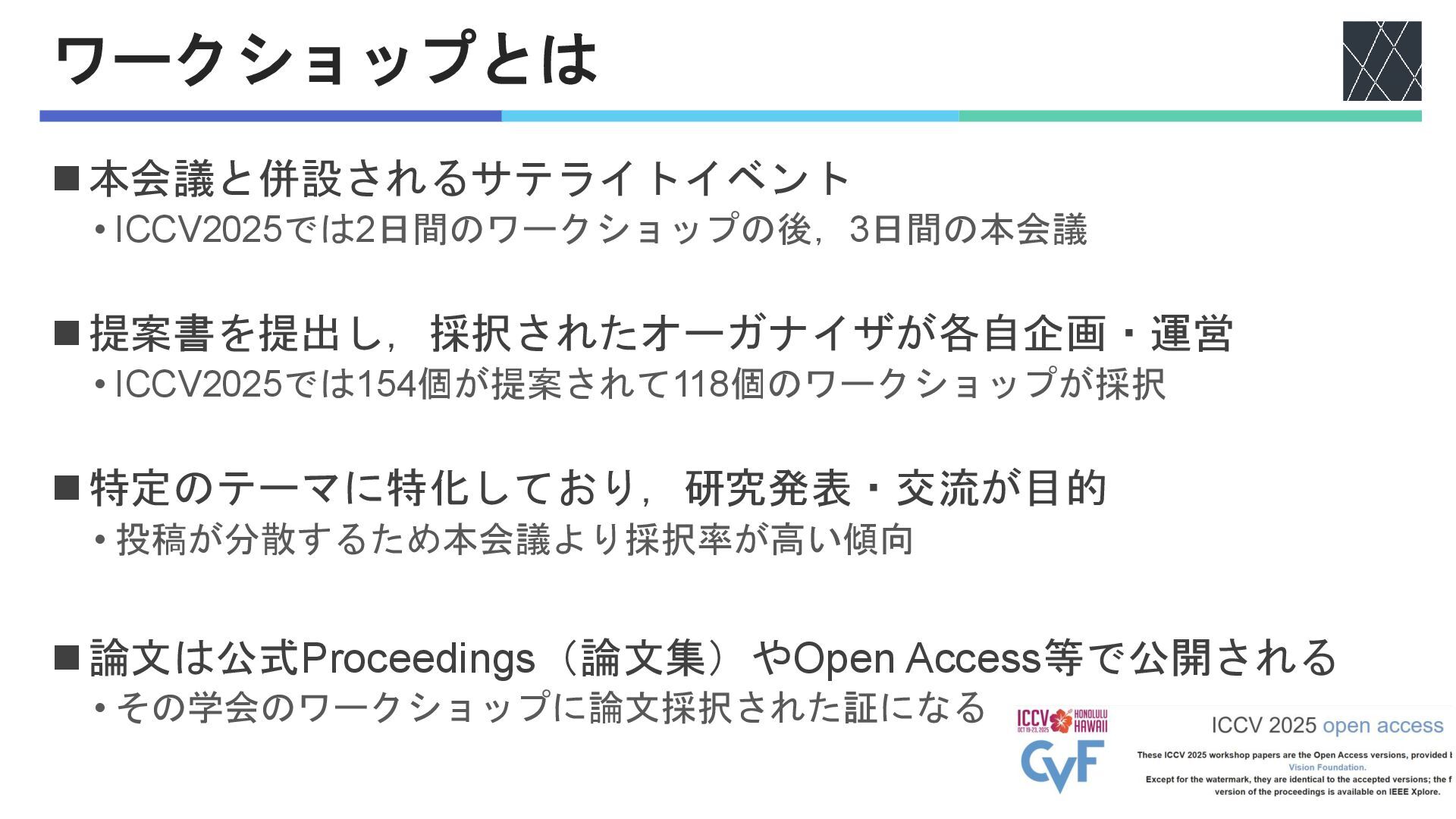 ワークショップとは ◼本会議と併設されるサテライトイベント • ICCV2025では2日間のワークショップの後,3日間の本会議 ◼提案書を提出し,採択されたオーガナイザが各自企画・運営 • ICCV2025では154個が提案されて118個のワークショップが採択 ◼特定のテーマに特化しており,研究発表・交流が目的 • 投稿が分散するため本会議より採択率が高い傾向