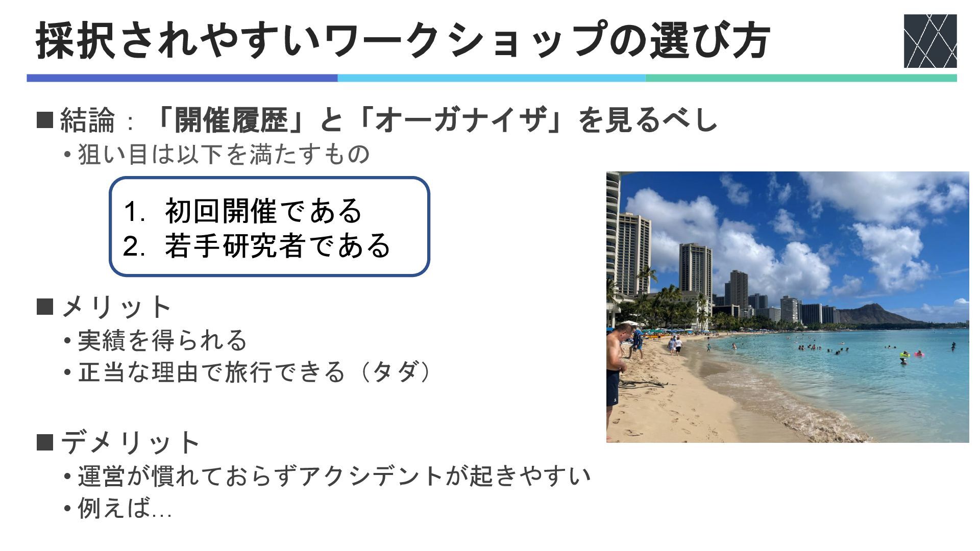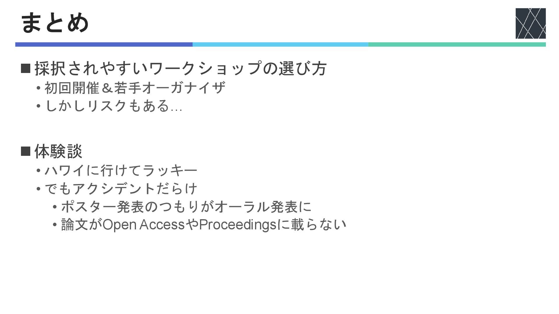 まとめ ◼採択されやすいワークショップの選び方 • 初回開催&若手オーガナイザ • しかしリスクもある… ◼体験談 • ハワイに行けてラッキー •