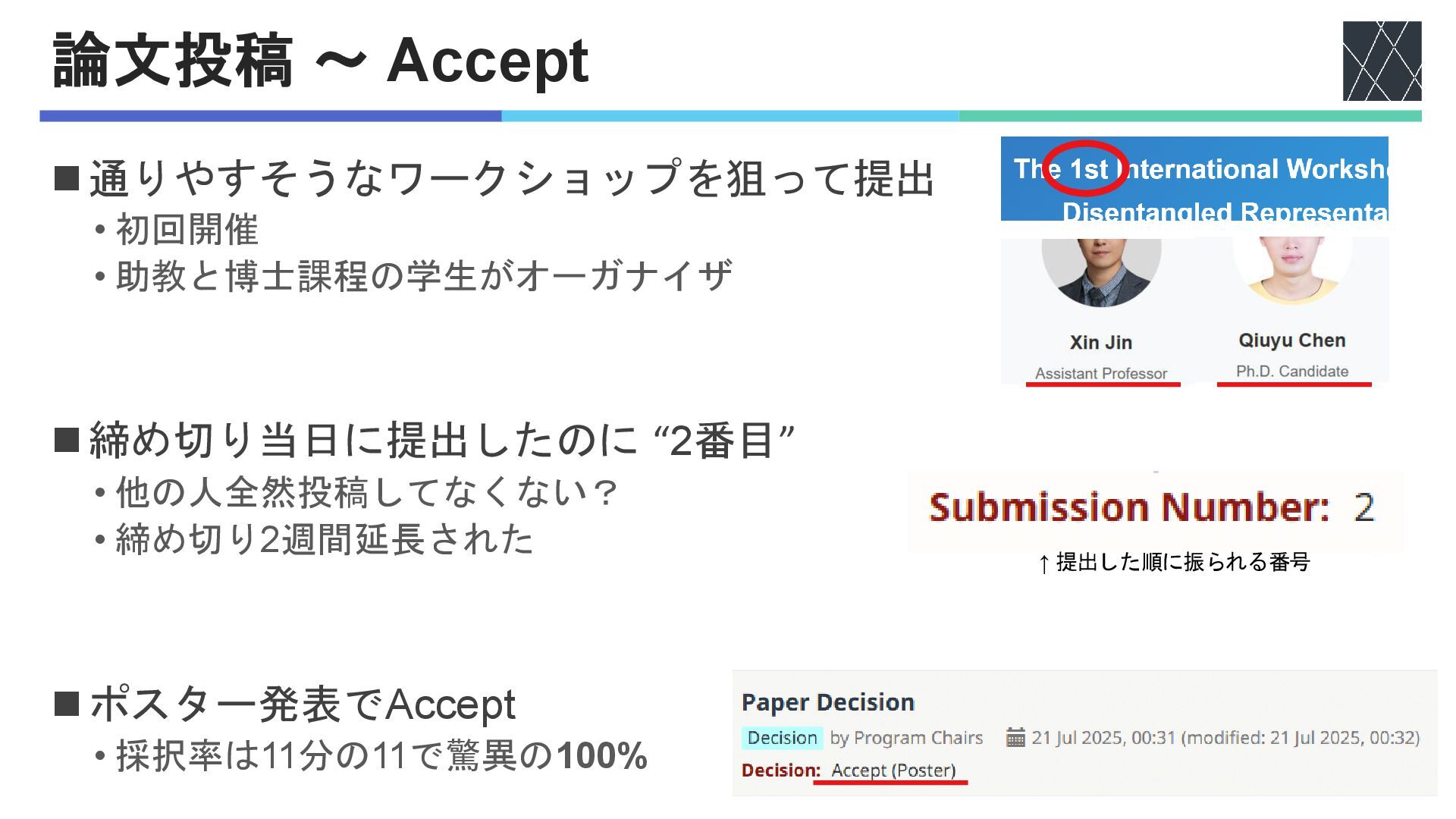 論文投稿 ~ Accept ◼通りやすそうなワークショップを狙って提出 • 初回開催 • 助教と博士課程の学生がオーガナイザ ◼締め切り当日に提出したのに “2番目”