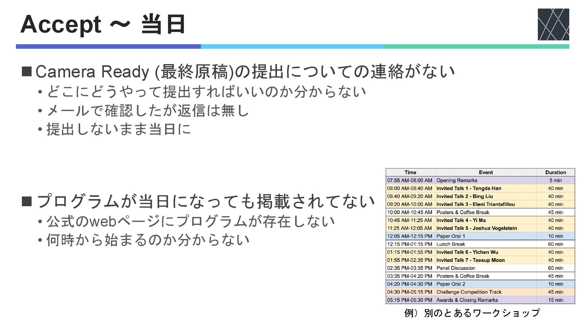 Accept ~ 当日 ◼Camera Ready (最終原稿)の提出についての連絡がない • どこにどうやって提出すればいいのか分からない • メールで確認したが返信は無し