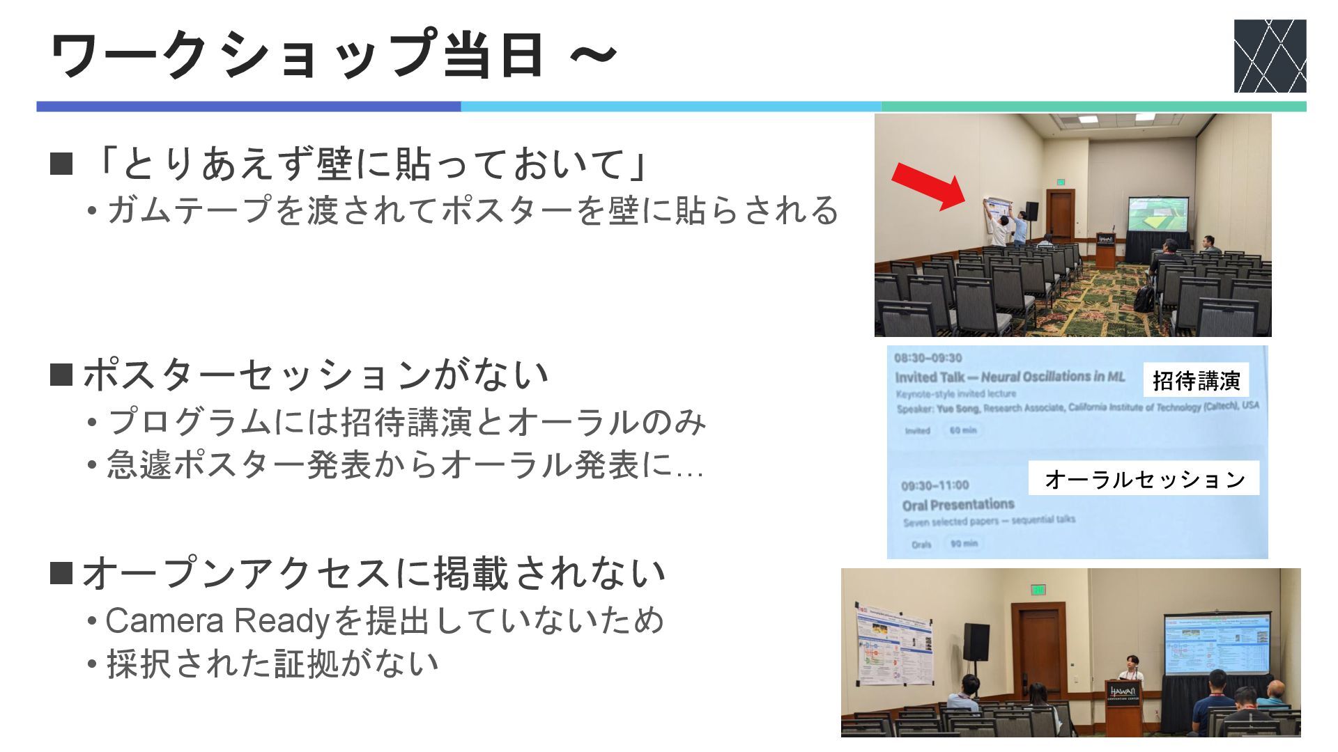 ワークショップ当日 ~ ◼「とりあえず壁に貼っておいて」 • ガムテープを渡されてポスターを壁に貼らされる ◼ポスターセッションがない • プログラムには招待講演とオーラルのみ • 急遽ポスター発表からオーラル発表に…