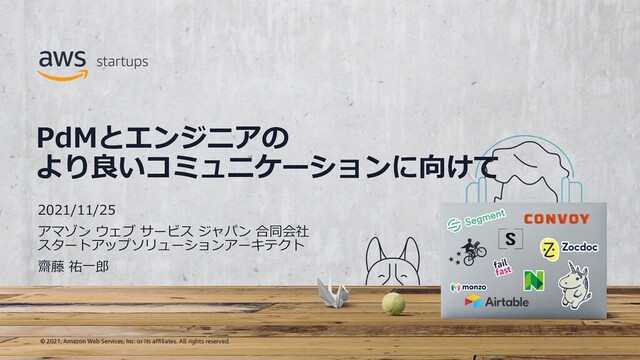 rights reserved. PdMとエンジニアの より良いコミュニケーションに向けて 2021/11/25 アマゾン ウェブ サービス ジャパン 合同会社 スタートアップソリューションアーキテクト 齋藤 祐⼀郎
