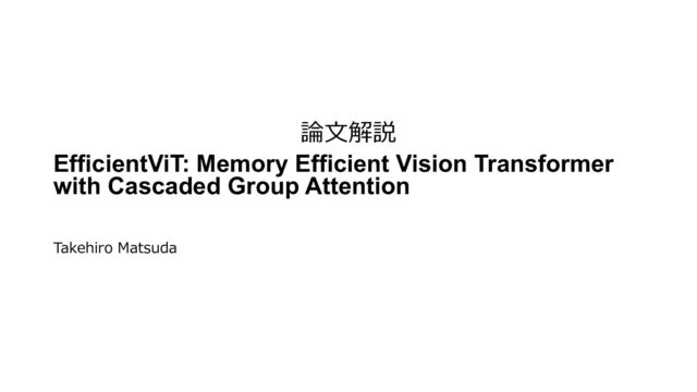 Group Attention • 論⽂: https://arxiv.org/abs/2305.07027 • コード: https://github.com/microsoft/Cream/tree/main/EfficientViT • 投稿学会: CVPR2023 • 著者: Xinyu Liu, Houwen Peng, Ningxin Zheng, Yuqing Yang, Han Hu, Yixuan Yuan • 所属: The Chinese University of Hong Kong, Microsoft Research 選んだ理由: • Vision Transformerをエッジデバイスなどで⾼速に実⾏するためにはどのような 構成にすればよいか学ぶことができそう
