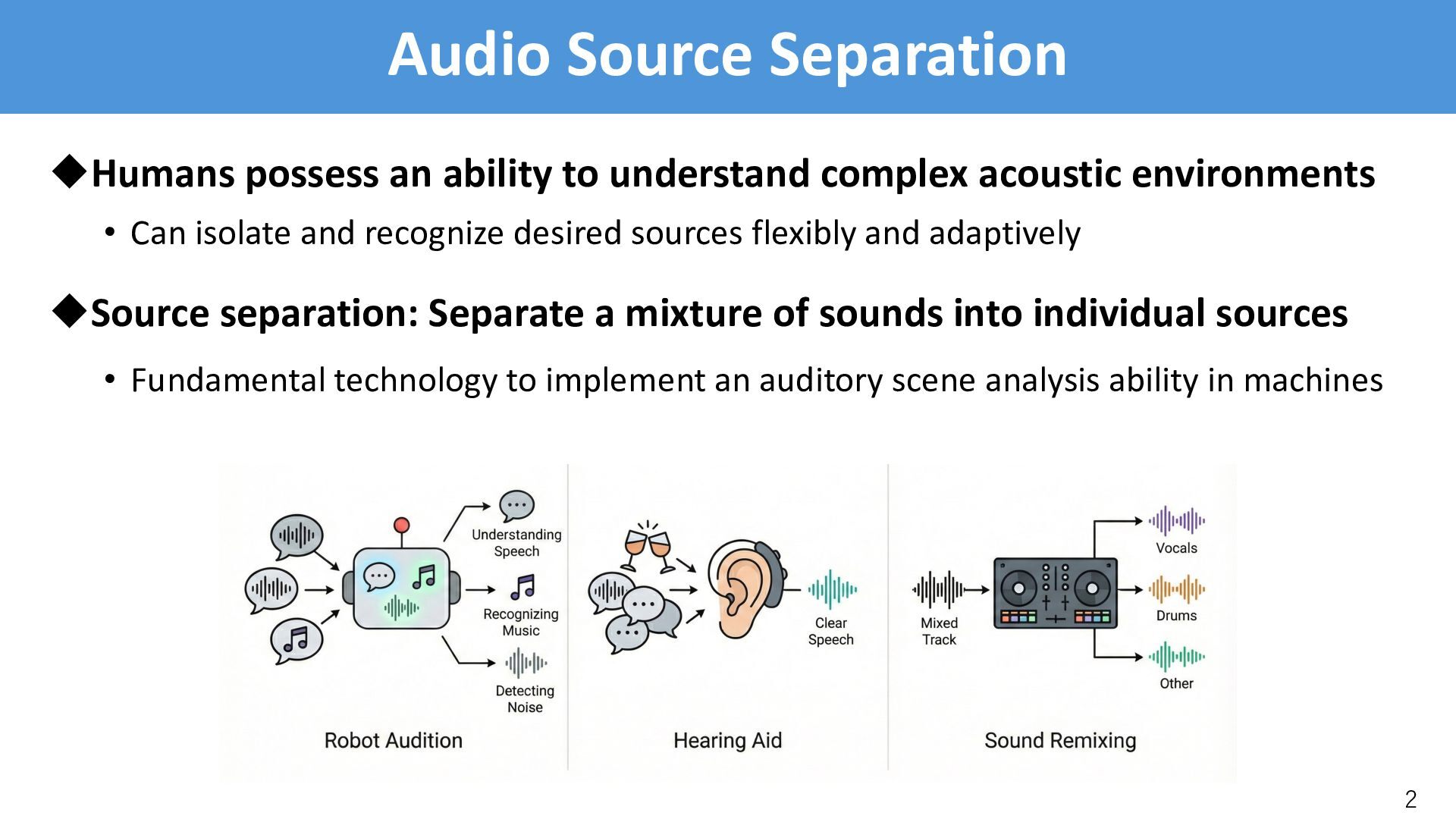 acoustic environments • Can isolate and recognize desired sources flexibly and adaptively uSource separation: Separate a mixture of sounds into individual sources • Fundamental technology to implement an auditory scene analysis ability in machines 2