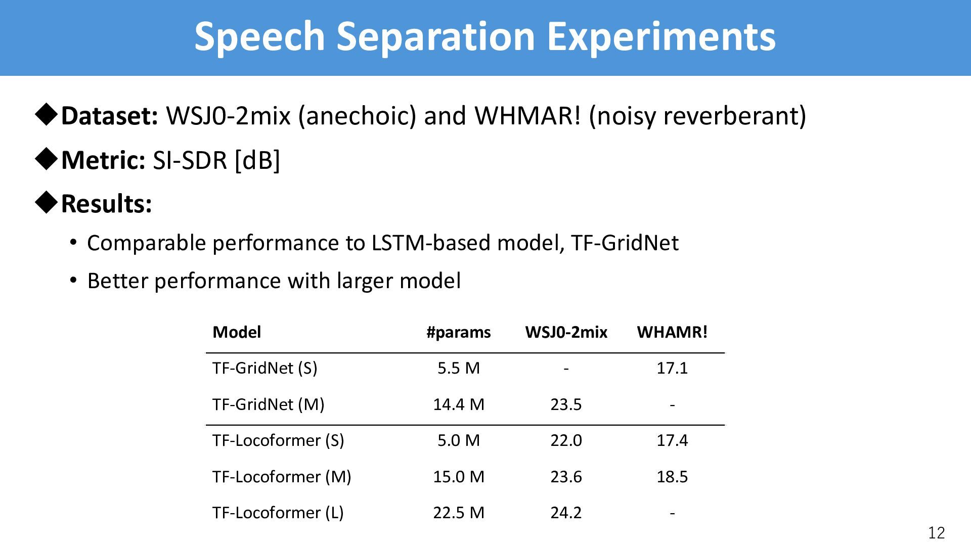 uMetric: SI-SDR [dB] uResults: • Comparable performance to LSTM-based model, TF-GridNet • Better performance with larger model 12 Model #params WSJ0-2mix WHAMR! TF-GridNet (S) 5.5 M - 17.1 TF-GridNet (M) 14.4 M 23.5 - TF-Locoformer (S) 5.0 M 22.0 17.4 TF-Locoformer (M) 15.0 M 23.6 18.5 TF-Locoformer (L) 22.5 M 24.2 -