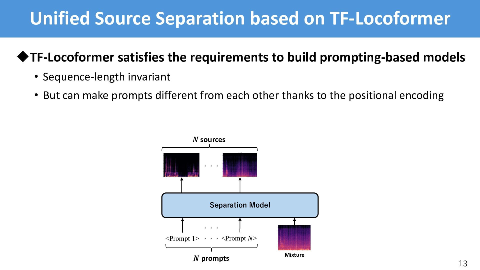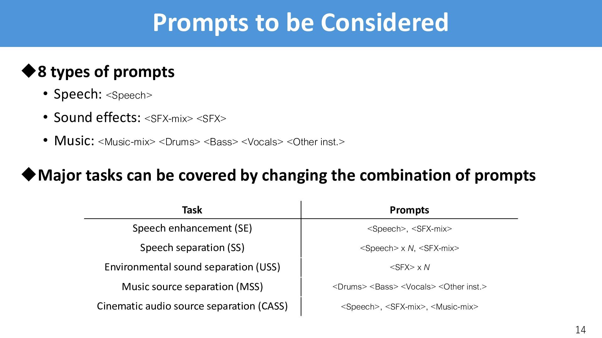 to build prompting-based models • Sequence-length invariant • But can make prompts different from each other thanks to the positional encoding 13 Separation Model Mixture <Prompt 1> <Prompt !> ・・・ ・・・ ! prompts ! sources ・・・