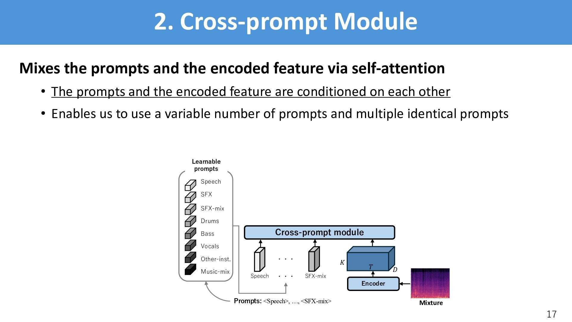 satisfies the requirements by using self-attention 15 ! " # Cross-prompt module Speech Learnable prompts SFX SFX-mix Drums Bass Vocals Other-inst. Music-mix Speech SFX-mix Conditional TSE module ・・・ Conditional TSE module Decoder Decoder Prompts: <Speech>, …, <SFX-mix> ・・・ ・・・ Shared Shared Encoder ・・・ Mixture Speech SFX-mix