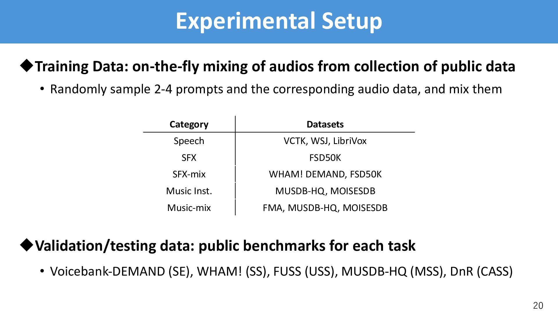 to STFT-domain • Inverse transformation of the encoder • Applied independently to each source 19 ! " # Cross-prompt module Speech Learnable prompts SFX SFX-mix Drums Bass Vocals Other-inst. Music-mix Speech SFX-mix Conditional TSE module ・・・ Conditional TSE module Decoder Decoder Prompts: <Speech>, …, <SFX-mix> ・・・ ・・・ Shared Shared Encoder ・・・ Mixture Speech SFX-mix