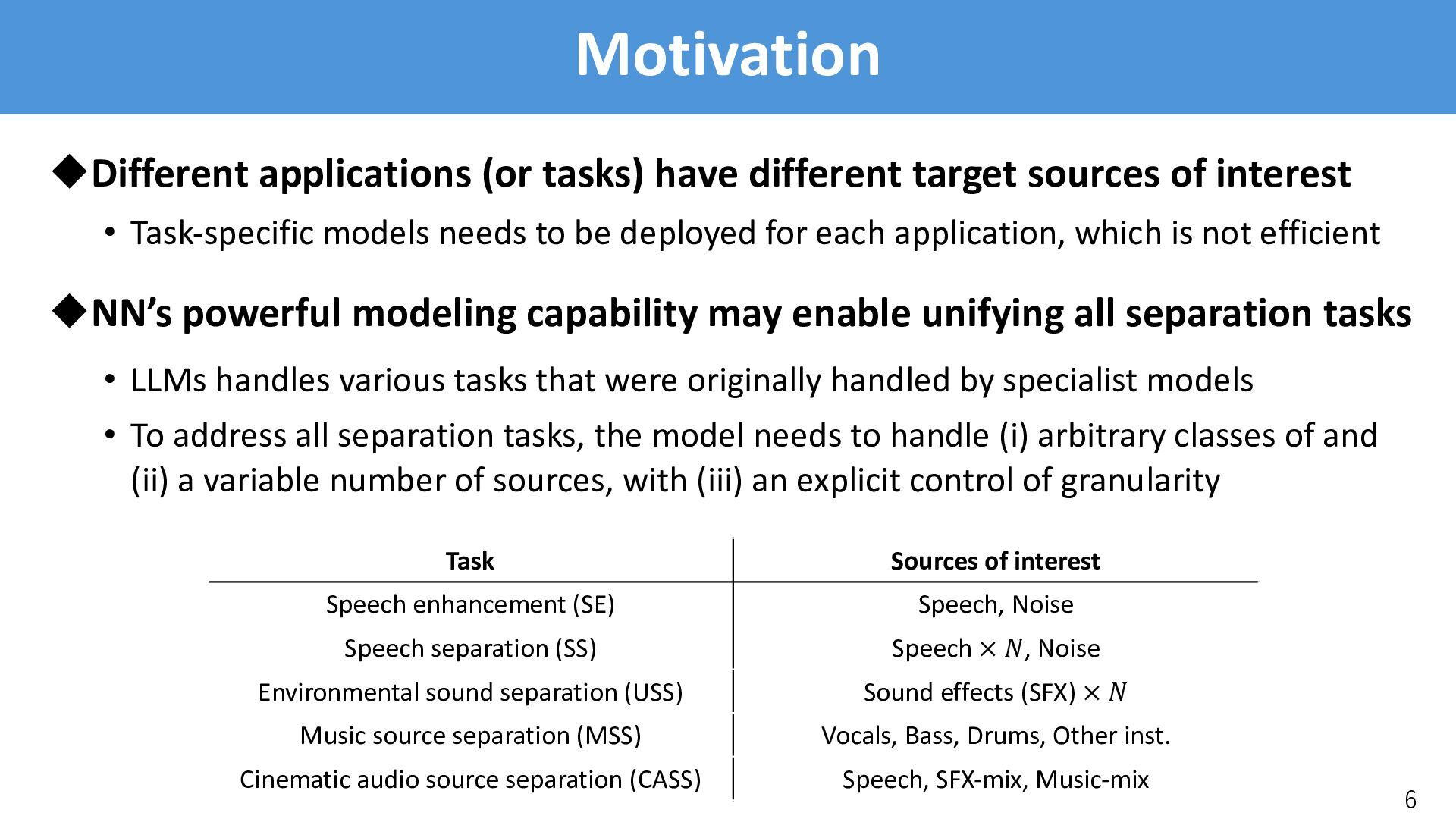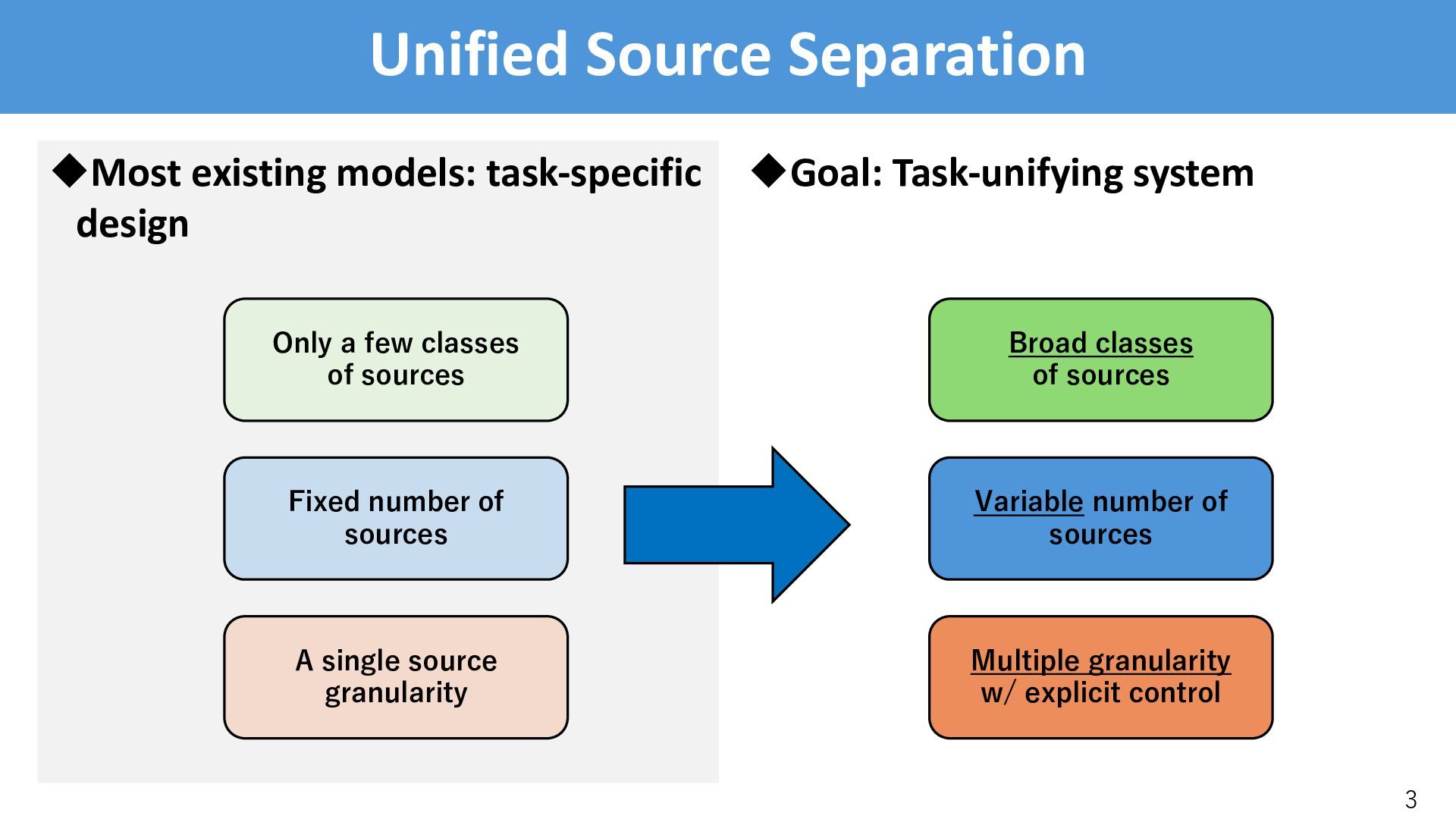 2. Unified Source Separation uMost existing models: task-specific design uGoal: Task-unifying